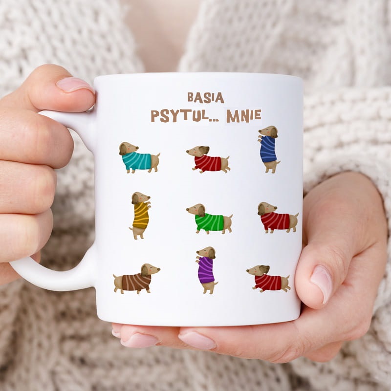 Kubek z jamnikami to idealny gadżet dla wszystkich miłośników psów, którzy lubią otaczać się przedmiotami z charakterem. Na białym tle kubka znalazły się urocze grafiki jamników w kolorowych sweterkach – od czerwonego i zielonego po niebieski czy fioletowy – każdy z nich prezentuje się inaczej. Towarzyszy im zabawny napis „Psytul… mnie”, który wprowadza lekki, humorystyczny akcent i wywołuje uśmiech przy każdym użyciu.