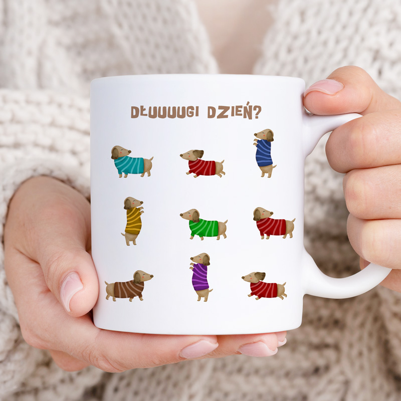 Kubek z jamnikami w kolorowych sweterkach z zabawnym napisem „Psytul… mnie” to praktyczny i humorystyczny gadżet dla miłośników psów.