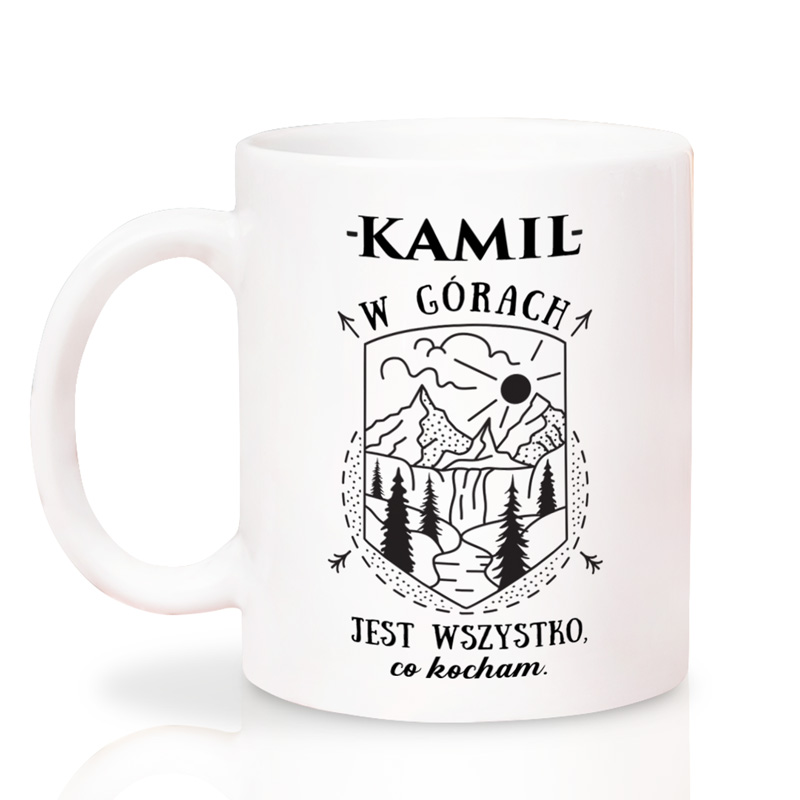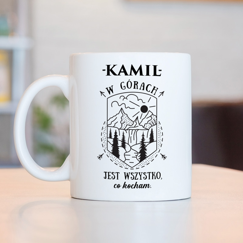 Kubek ceramiczny jest w białym kolorze. Na nim znajduje się czarna grafika przedstawiająca majestatyczne góry, drzewa i wąską ścieżkę prowadzącą ku słońcu. U góry znajduje się imię, a poniżej napis “W górach jest wszystko, co kocham”. Personalizacji podlega imię, dzięki czemu możesz stworzyć unikalny prezent dopasowany do konkretnej osoby.