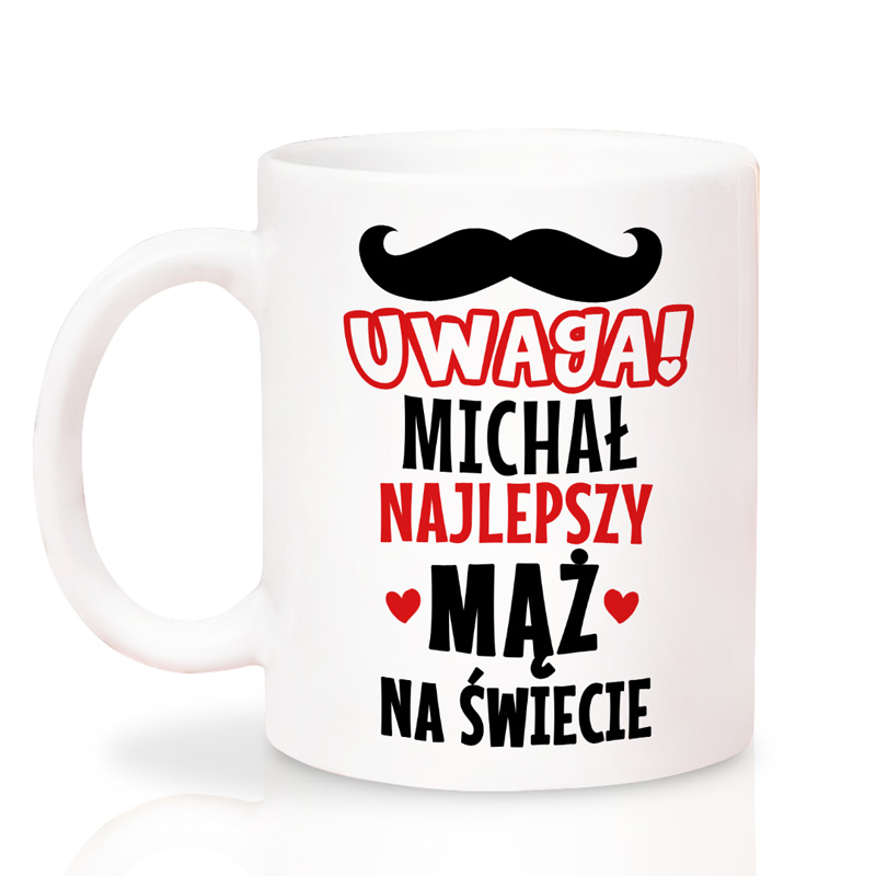 Biały kubek, w klasyczny stylu, posiada wygodne ucho do trzymania. Na kubku znajduje się tekst, który zadedykowaliśmy dla najlepszego męża. Napis jest dekoracyjny, duży i czytelny, a przede wszystkim zawiera także imię mężczyzny, dla którego jest kubek. Napis ma kolorystykę czarno-czerwoną. Dodatkowo oprócz tekstu na kubku są również ozdobne elementy graficzne w postaci czarnych męskich wąsów oraz czerwonych serc. Napis na kubku wykonujemy trwałą metodą sublimacji.