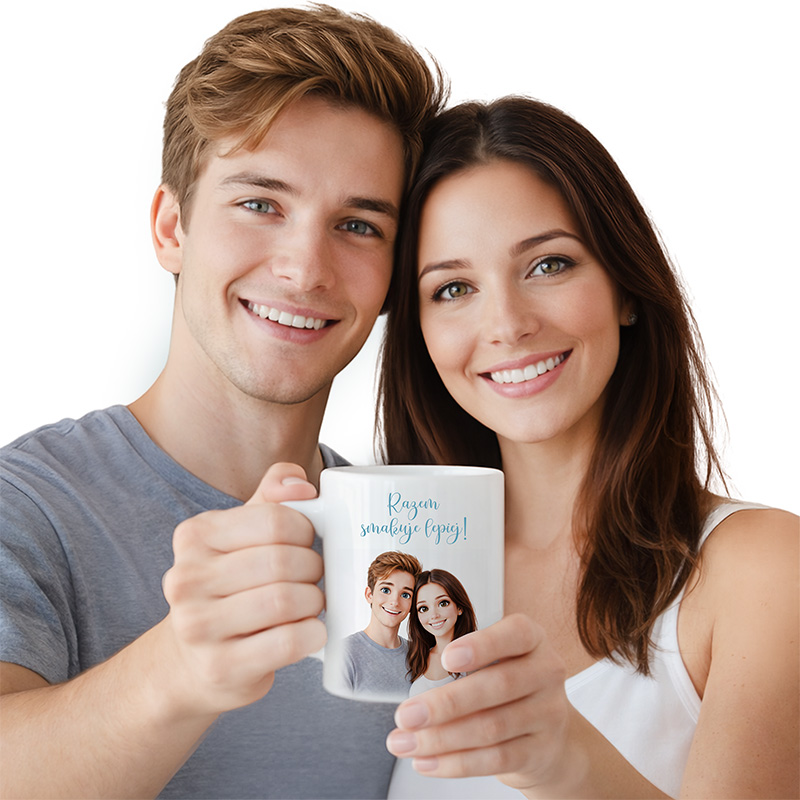 Kubek ze zdjęciem w bajkowym stylu to wyjątkowy fotoprezent dla pary, który zamienia wspólne zdjęcie w uroczą ilustrację jak z animacji.