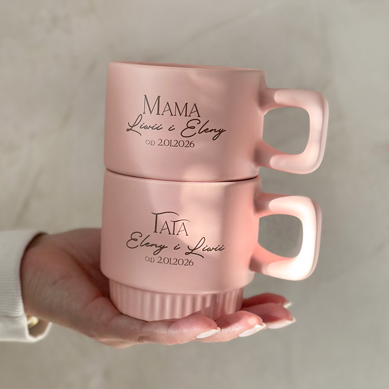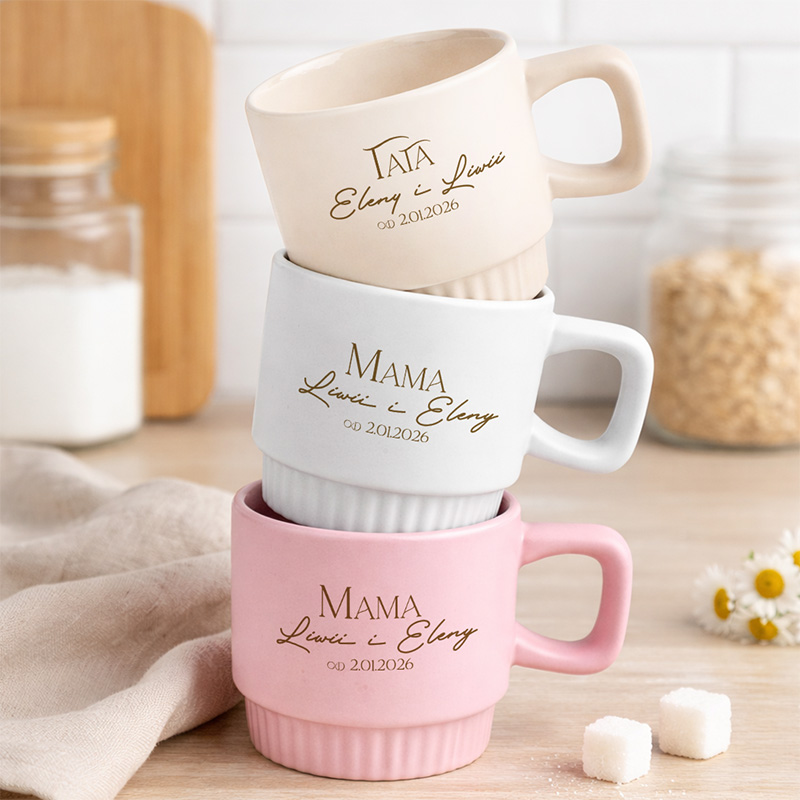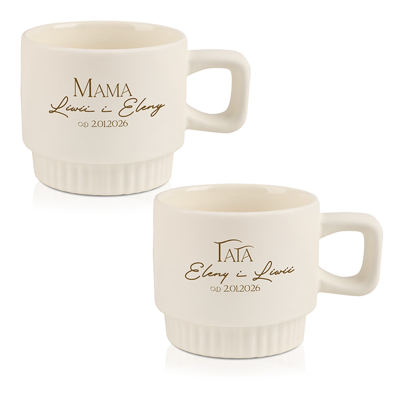 Kubki wykonane są z wysokiej jakości ceramiki, posiadają wygodne ucho i ryflowany dół, który nadaje im nowoczesny charakter. Dostępne są w różnych kolorach, dzięki czemu można dopasować je do gustu obdarowanych. Na froncie każdego kubka znajduje się personalizowany napis zawierający imiona dzieci oraz datę – dzień, który na zawsze zmienił życie Mamy i Taty.