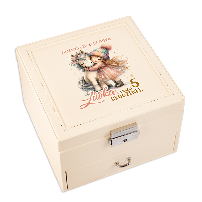 Szukasz niezapomnianego prezentu na urodziny dla dziewczynki? Personalizowany kuferek na biżuterię dla Dziewczynki w odcieniu kremowym to wyjątkowy upominek, który łączy funkcjonalność z bajkowym designem. Na wieczku znajduje się urocza ilustracja dziewczynki przytulającej jednorożca, obok której widnieje imię oraz wiek jubilatki. Dzięki personalizacji upominek nabiera unikalnego charakteru i sprawia radość każdej małej właścicielce. Wnętrze szkatułki zaprojektowano z myślą o porządku i bezpieczeństwie dziecięcych skarbów. Znajdują się tam przegródki na pierścionki, kolczyki, bransoletki oraz inne ozdoby. Wbudowane lusterko pozwala dziecku przeglądać swoje akcesoria i cieszyć się ich widokiem. Dodatkowa szufladka umożliwia wygodne przechowywanie większych przedmiotów, na przykład spinek do włosów czy drobnych pamiątek.