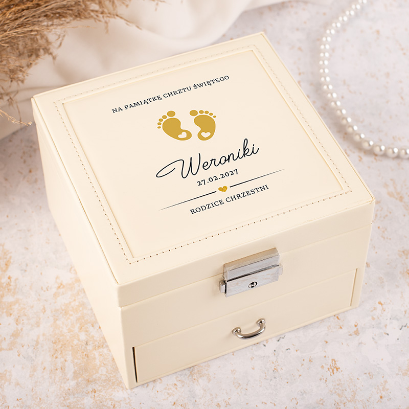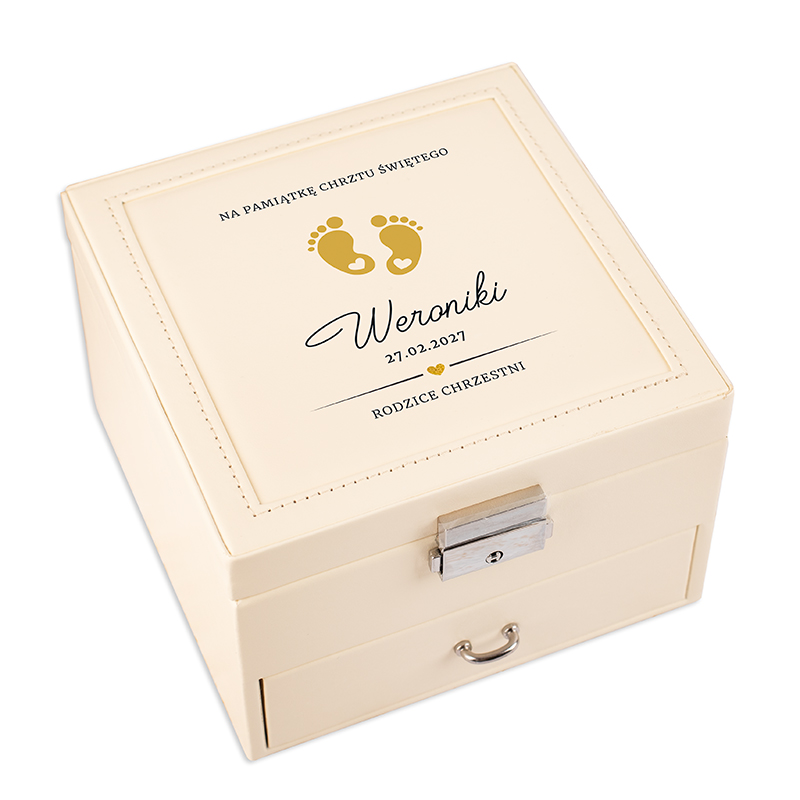 Jeśli szukasz prezent na Chrzest dla dziewczynki, który wyróżni się wśród klasycznych upominków, personalizowana szkatułka na biżuterię będzie doskonałym wyborem. Jej subtelny wygląd w kolorze kremowym oraz personalizacja poprzez dodania imienia dziecka, daty uroczystości i dedykacji sprawiają, że produkt nabiera osobistego charakteru. Taki upominek nie tylko pięknie wygląda, ale także pozostaje wyjątkową pamiątką na długie lata. Na wieczku szkatułki znajduje się złoty nadruk z motywem stópek.