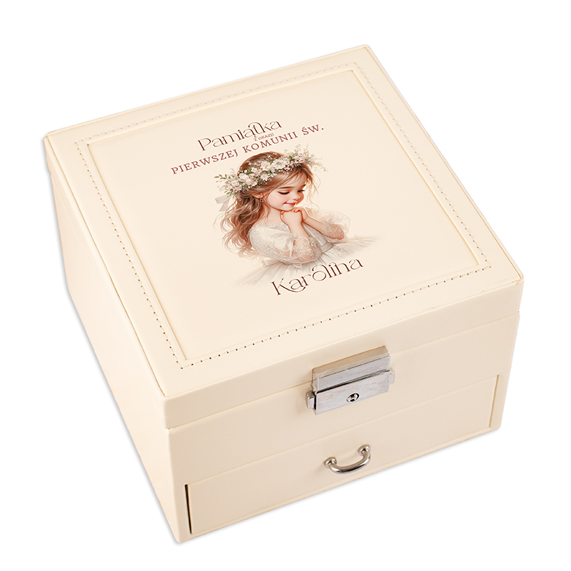 Wybór odpowiedniego prezentu z okazji Pierwszej Komunii Świętej to dla wielu osób nie lada wyzwanie. W końcu to nie tylko uroczystość religijna, ale także dzień pełen emocji, symboli i niezapomnianych wspomnień. Właśnie dlatego warto podarować coś, co zachwyci i będzie towarzyszyć obdarowanej osobie dłuższy czas. Szkatułka została wykonana z dbałością o każdy szczegół. Jej subtelny, kremowy kolor idealnie pasuje do delikatnej, dziewczęcej estetyki. Na wieczku znajduje się grafika przedstawiająca dziewczynkę w komunijnej sukience oraz imię właścicielki szkatułki. Personalizacja w postaci nadrukowanego imienia sprawia, że każda sztuka staje się niepowtarzalna.