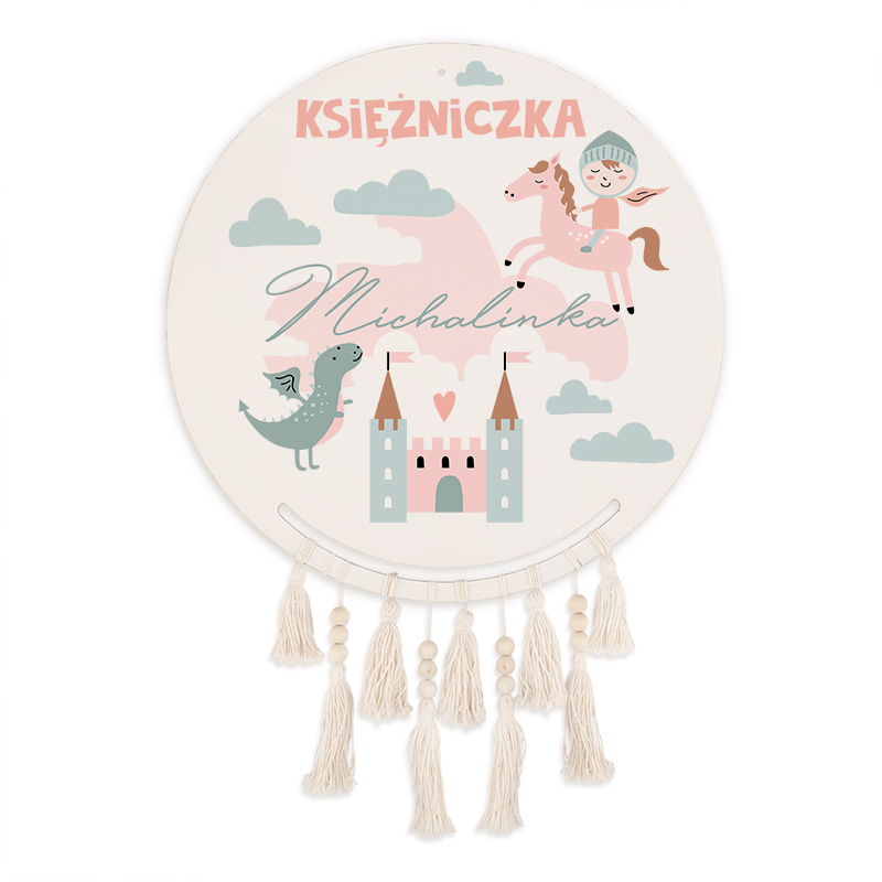 Okrągła dekoracja ścienna z nazwą 'Księżniczka Michalinka', przedstawiająca rysunki konia, smoka, zamku oraz chmur na jasnym tle, zwieńczona frędzlami i koralikami.