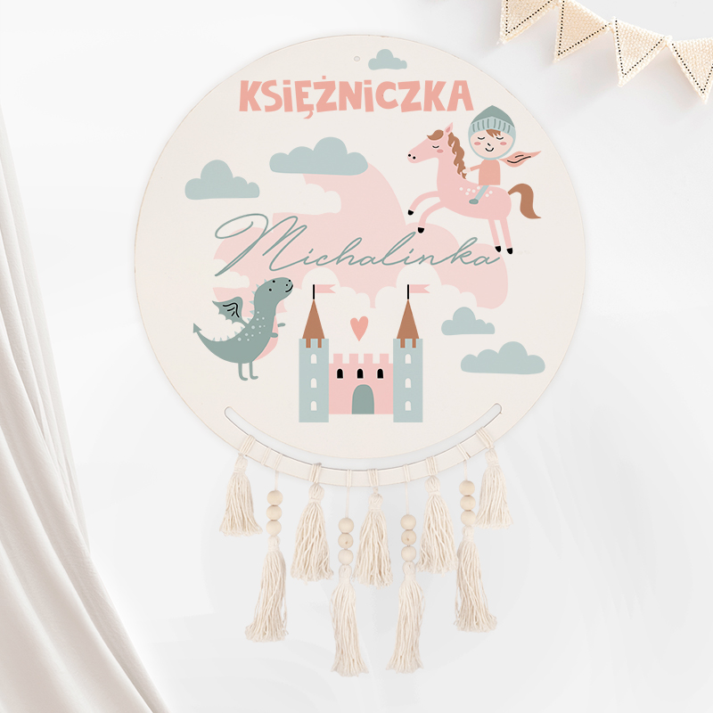 • Dekoracyjną czcionką wykonamy napis Księżniczka, wraz z imieniem dziewczynki. Całość zachowana w jasnej, pastelowej kolorystyce z pewnością wpisuje się w najnowsze trendy. Łapacz wzbogacony o dekorację w postaci frędzelków.