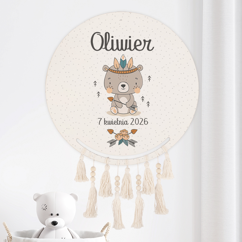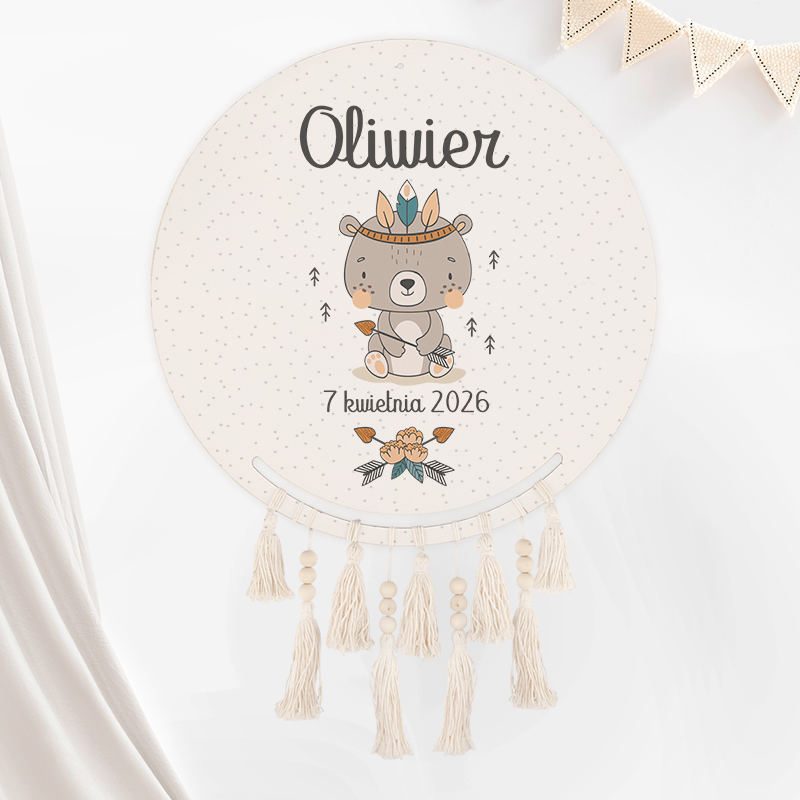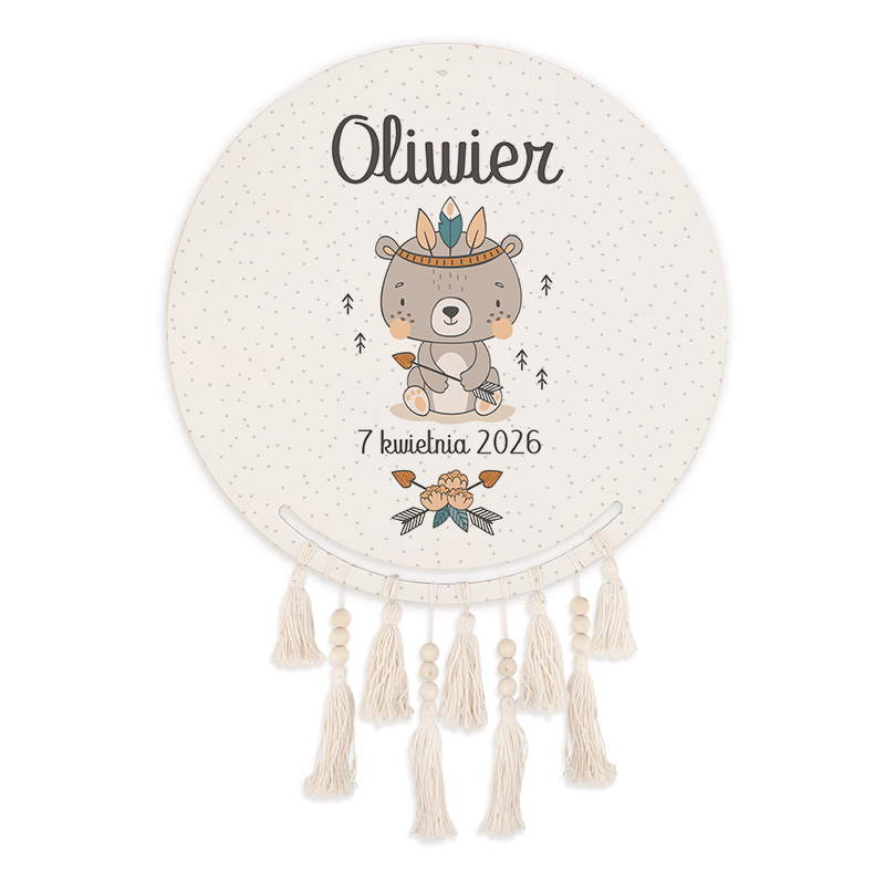 - Środek drewnianej tarczy zajmuje uroczy Miś Indianin, który na puchatej główce ma indiański pióropusz, a w łapce trzyma strzałę. Nad misiem umieścimy imię dziecka, dla którego będzie medalion, natomiast pod misiem znajdzie się data narodzin.
