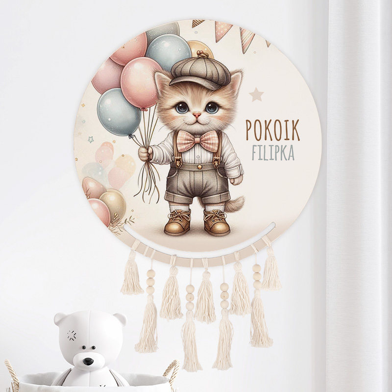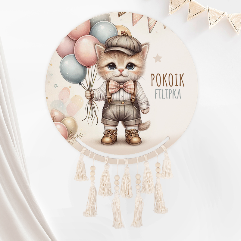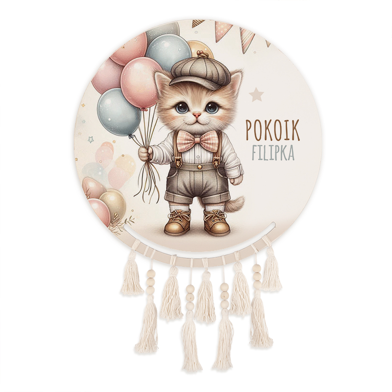 Piękny łapacz snów z kotkiem wykonany został z wysokiej jakości materiałów, a jego główną ozdobą jest pełna detali grafika przedstawiająca uroczego kotka. Kotek ubrany w elegancki strój retro – z muszką, szelkami i kapeluszem – trzyma w łapkach kolorowe balony, które dodają kompozycji lekkości i radości. Całość utrzymana jest w delikatnych, pastelowych barwach, idealnie komponujących się z dziecięcym wnętrzem. Na tle widoczna jest nazwa: