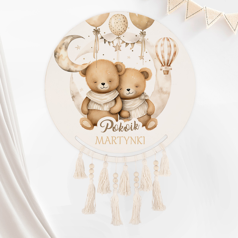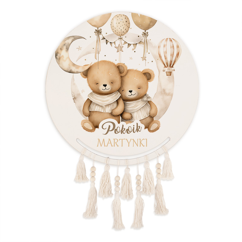 Łapacz snów z imieniem to unikalna dekoracja, która zachwyca swoim wyglądem i starannością wykonania. Na okrągłej tarczy widnieje urocza ilustracja dwóch misiów, przytulonych do siebie, w otoczeniu balonów i gwiazdek, które dodają całości bajkowego klimatu. Nad nimi umieszczono napis: