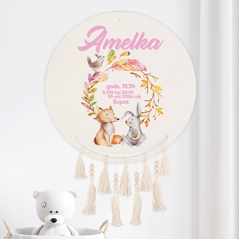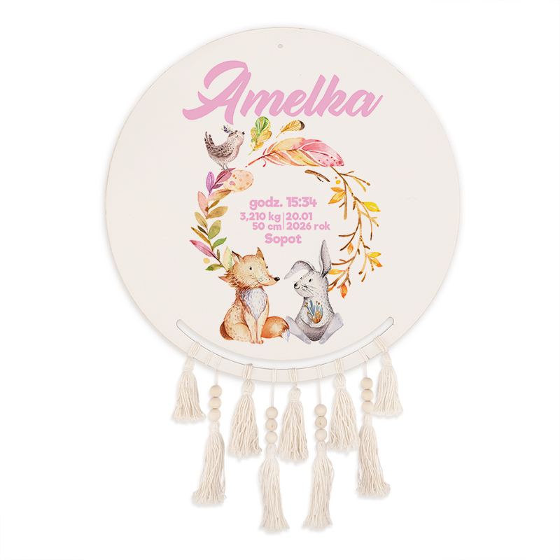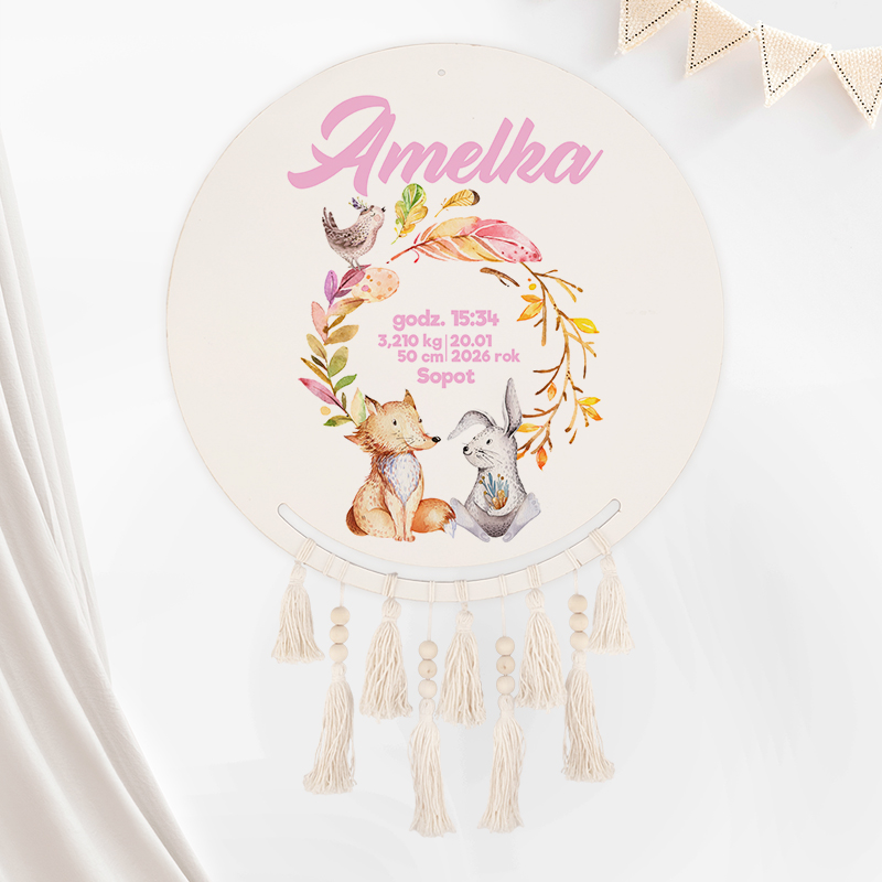 Śliczny łapacz snów do pokoju dziecięcego z ciekawą formą metryczki. Dane z chwili urodzenia w sposób wyraźny i czytelny dla dzieci są wkomponowane w obrazek pełen dzikich zwierzątek. Super dekoracja w postaci łapacza nada przestrzeni indywidualnego charakteru, a po latach będzie to również miła pamiątka.