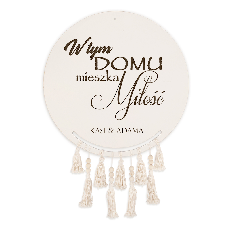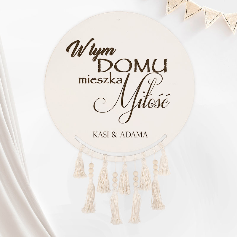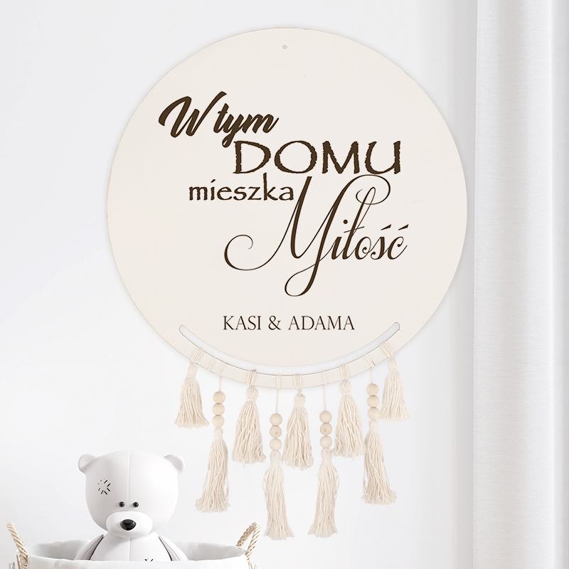 - wykonany z drewna w formie koła z ozdobnym nadrukiem, w formie napisu “W tym domu mieszka miłość”