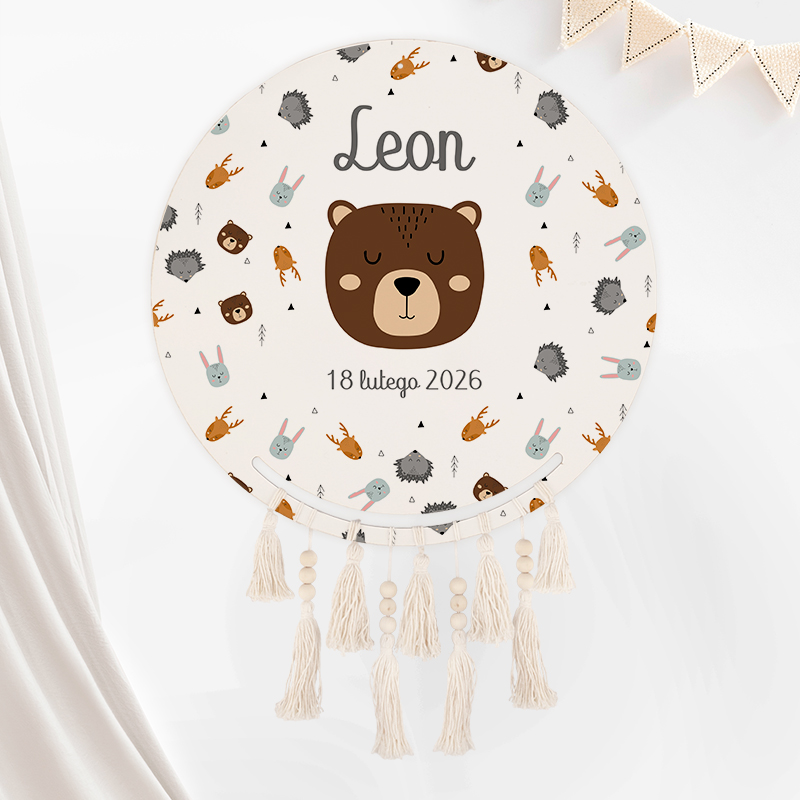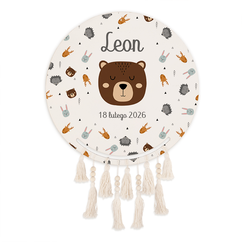- Na Łapaczu znajduje się motyw graficzny zainspirowany najnowszymi trendami. Zwierzątka leśne rozproszone są po całej powierzchni, a na samym środku honorowe miejsce zajmuje śpiący niedźwiadek. Całość dopełni imię Waszego maluszka oraz data narodzin.