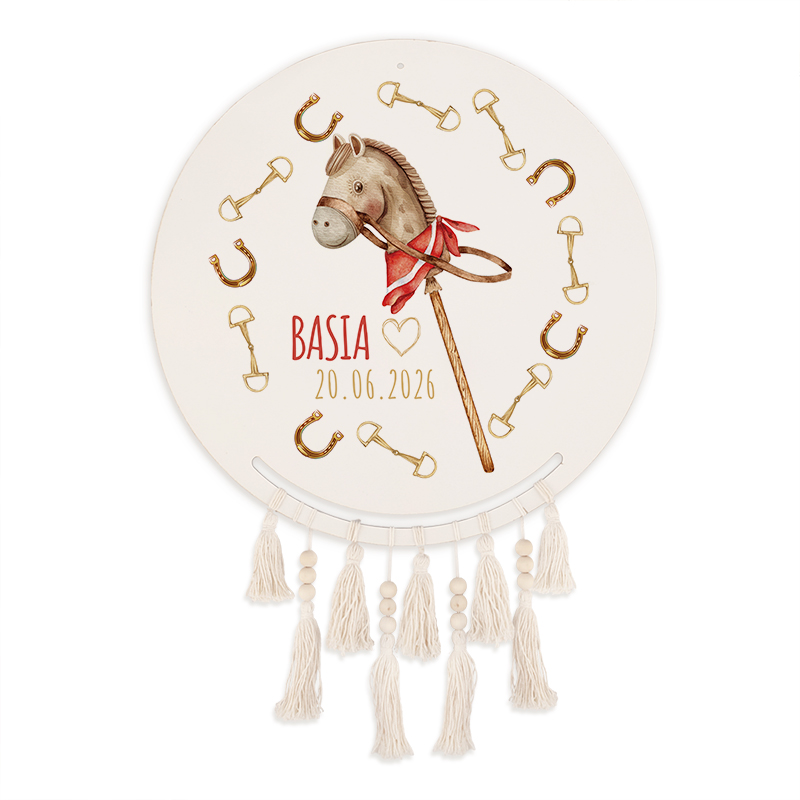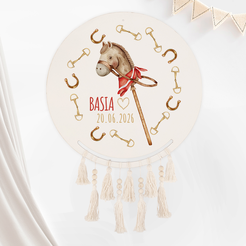 Centralnym motywem jest głowa konia na biegunach, ozdobiona czerwoną chustką, co dodaje całości wyrazistości i stylu. Konik otoczony delikatnymi podkowami w złotym kolorze, które są symbolem szczęścia i ochrony. Na grafice umieszczono imię dziecka oraz datę, co pozwala na pełną personalizację produktu. Pod okrągłą, białą tablicą zawieszono, beżowe frędzle, które nadają lekkości tworząc piękną, harmonijną całość. Średnica łapacza snów wynosi 33,5 cm, co sprawia, że stanowi wyrazisty element dekoracyjny, który jednak nie dominuje nad całym pomieszczeniem. Łapacz snów to doskonały prezent dla każdego miłośnika koni. Wzbogacaj swoje wnętrze o symbole spokoju i pozytywnej energii, które codziennie będą przypominać Ci o marzeniach i celach.