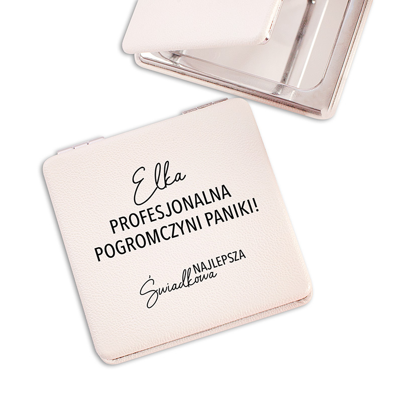 Na froncie lusterka znajduje się nadruk w humorystycznym tonie: „[Imię] profesjonalna pogromczyni paniki!” oraz podpis: „Najlepsza świadkowa”, który podkreśla rolę, jaką pełniła obdarowana osoba w przygotowaniach i podczas samego ślubu. Niezależnie czy chodzi o poprawienie makijażu, szybkie spojrzenie na fryzurę czy szybki retusz w biegu – lusterko zawsze spełni swoją rolę.