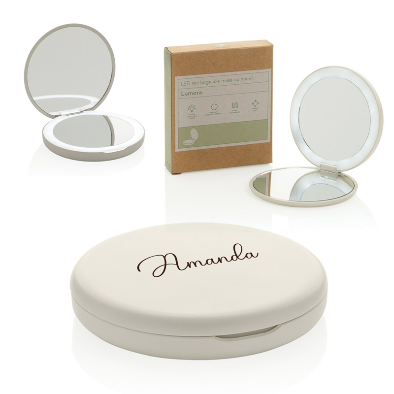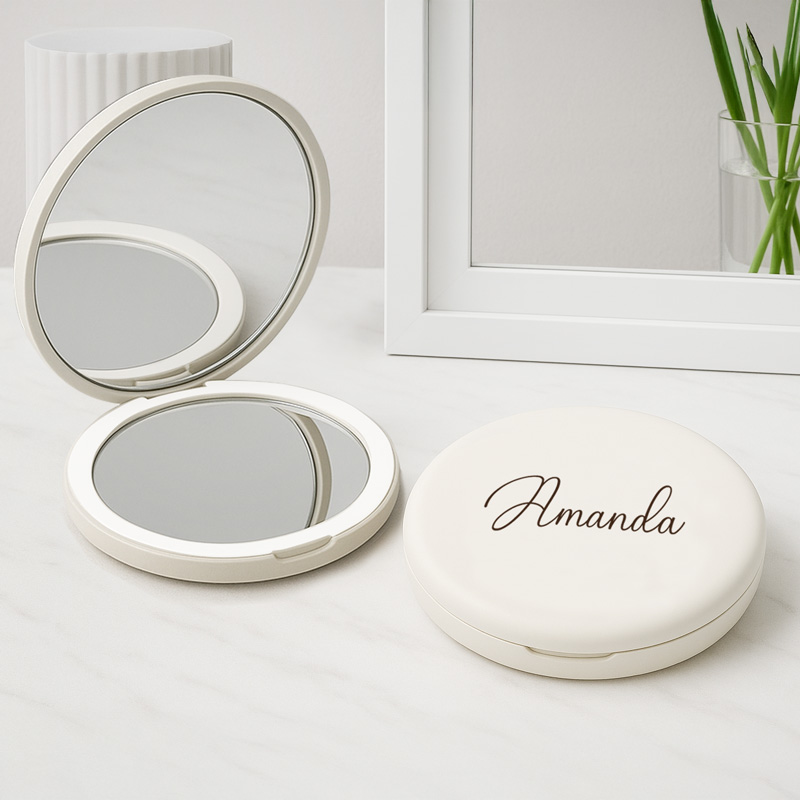 Kompaktowe lusterko z podświetleniem LED i imieniem to niezastąpiony dodatek na co dzień i w podróży.
