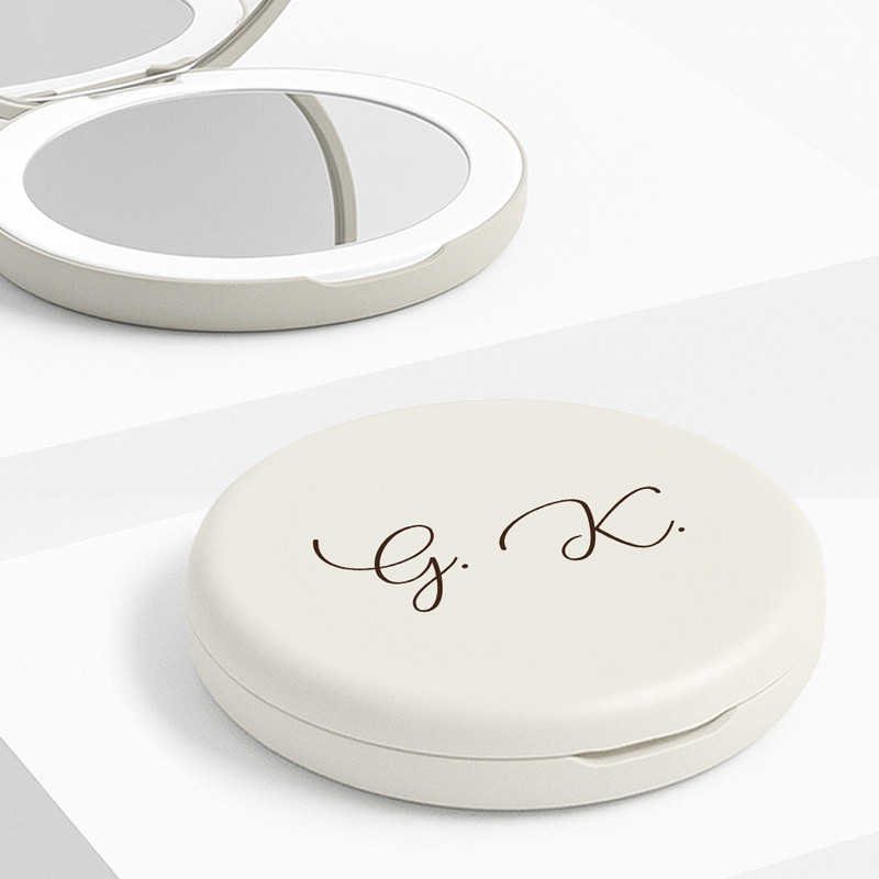 Okrągłe lusterko w beżowej obudowie z eleganckim napisem 'G. K.' na pokrywie, leżące na białej powierzchni obok otwartego lusterka o podwójnej tafli.