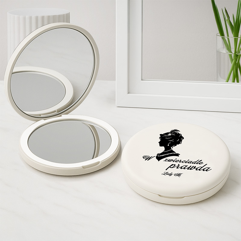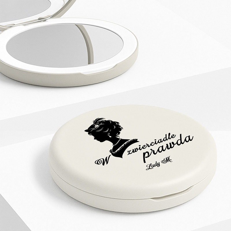 Lusterko zostało wykonane z tworzywa w delikatnym białym odcieniu. Wewnątrz znajdują się dwa praktyczne lusterka. Ponadto lusterko wyposażono w podświetlenie LED. Dzięki temu makijaż, poprawki fryzury czy pielęgnacja skóry stają się znacznie wygodniejsze. Na obudowie znalazła się elegancka grafika kobiecego profilu w stylu angielskim oraz napis „W zwierciadle prawda – Lady [inicjał]”. Personalizacja inicjałem sprawia, że lusterko staje się wyjątkowym upominkiem.