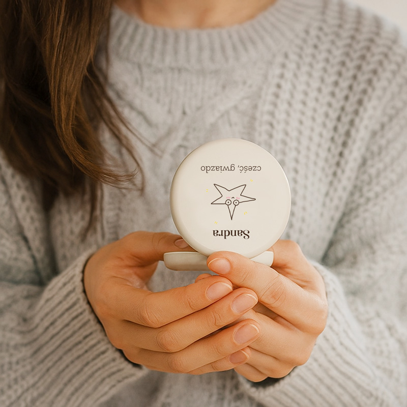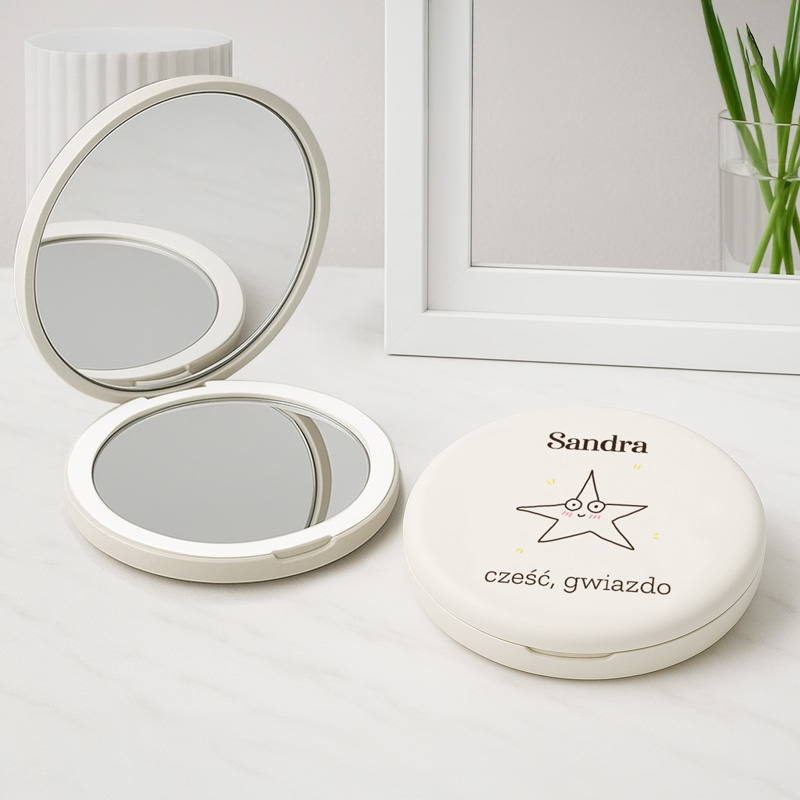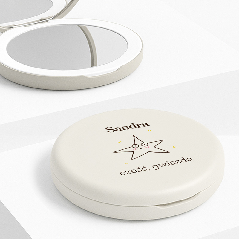 Okrągłe lusterko do makijażu z szarym otoczeniem, na górnej części znajduje się napis "Sandra" oraz rysunek uśmiechniętej gwiazdy z napisem "cześć, gwiazdo".