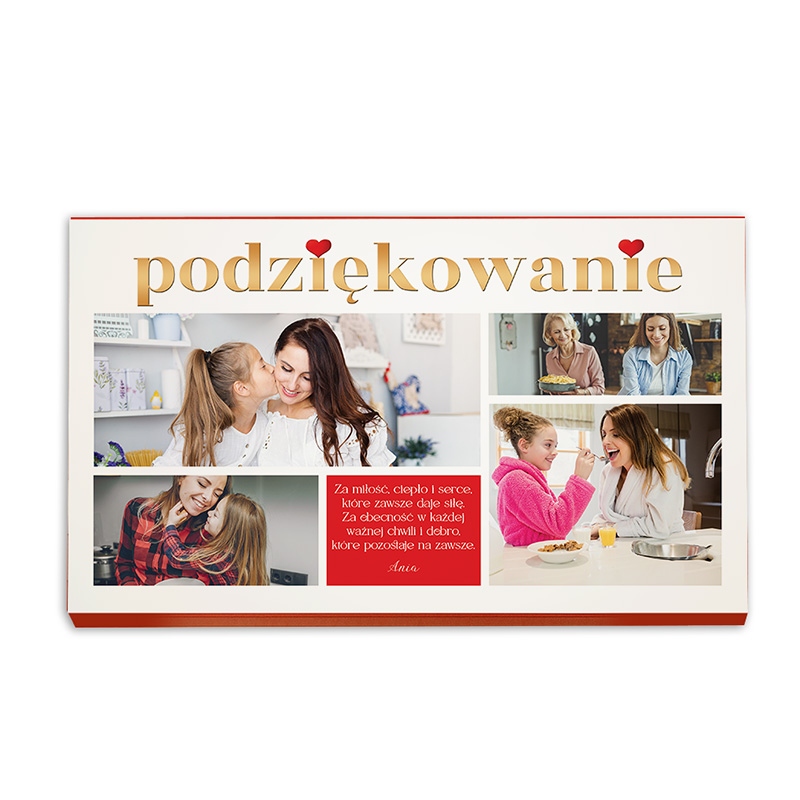 Bombonierka czekoladek Merci zawiera czekoladki w ośmiu różnych smakach, które słyną z wyjątkowego smaku i wysokiej jakości. Opakowanie zawiera personalizowane zdjęcia oraz ozdobny napis “podziękowanie”. Na froncie znajduje się także wzruszający tekst: „Za miłość, ciepło i serce, które zawsze daje siłę. Za obecność w każdej ważnej chwili i dobro, które pozostaje na zawsze”. Dodatkowo pod tekstem umieszczony zostanie personalizowany podpis.