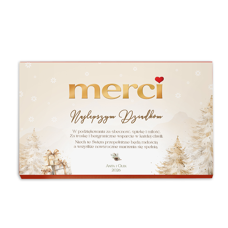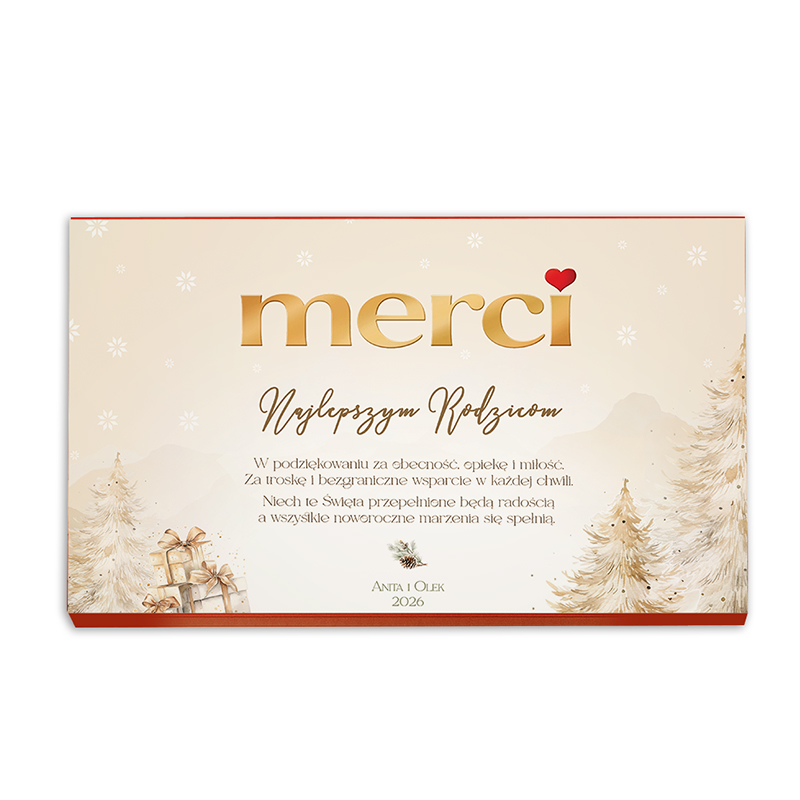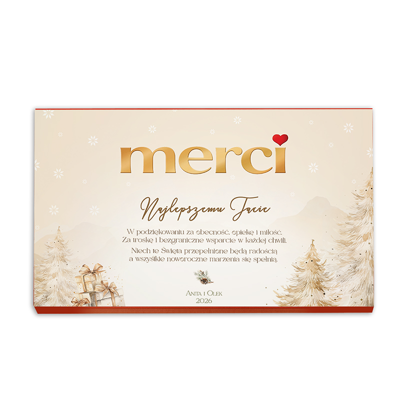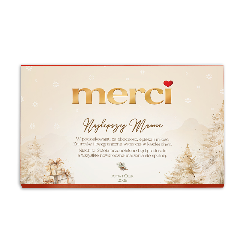 Opakowanie bombonierki zostało stworzone z dbałością o świąteczne detale – na froncie dominuje elegancki napis w odcieniach złota „merci”, uzupełniony personalizowaną dedykacją z podpisem i rokiem. Po środku widnieją uniwersalne podziękowania i życzenia. W tle widoczne są delikatne grafiki choinek i prezentów w pastelowej tonacji. Samo wnętrze zawiera klasyczny zestaw czekoladek Merci w różnych smakach. Dzięki wysokiej jakości nadrukowi personalizacja prezentuje się estetycznie i profesjonalnie.