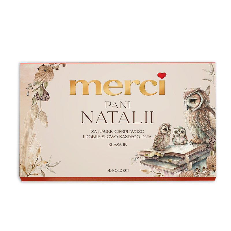 Bombonierka Merci zawiera zestaw wykwintnych czekoladek, zapakowanych w ozdobne pudełko z możliwością personalizacji. Na froncie znajduje się nadruk z imieniem nauczyciela oraz dedykacją od klasy, dzięki czemu prezent nabiera osobistego charakteru. Subtelna grafika z sowami i książkami w pastelowych odcieniach beżu i brązu dodaje całości elegancji, a jednocześnie ciepła.