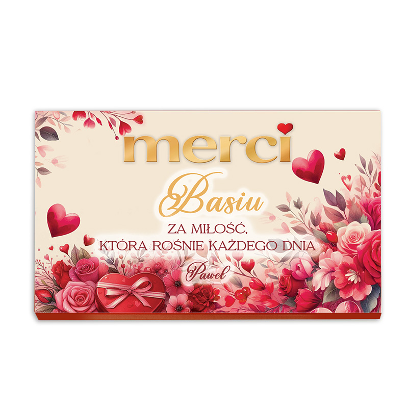 Front bombonierki zdobi romantyczna grafika, przedstawiająca różowe i czerwone kwiaty oraz delikatne serca. Centralne miejsce zajmuje elegancki napis „merci”, co po francusku oznacza “dziękuję”. Tuż pod nim znajduje się imię ukochanej osoby, zapisane ozdobną czcionką. A poniżej umieszczony został wzruszający tekst: „Za miłość, która rośnie każdego dnia”. Całość dopełnia podpis osoby wręczającej. W środku znajdują się znane i lubiane czekoladki MERCI w ośmiu różnych smakach.