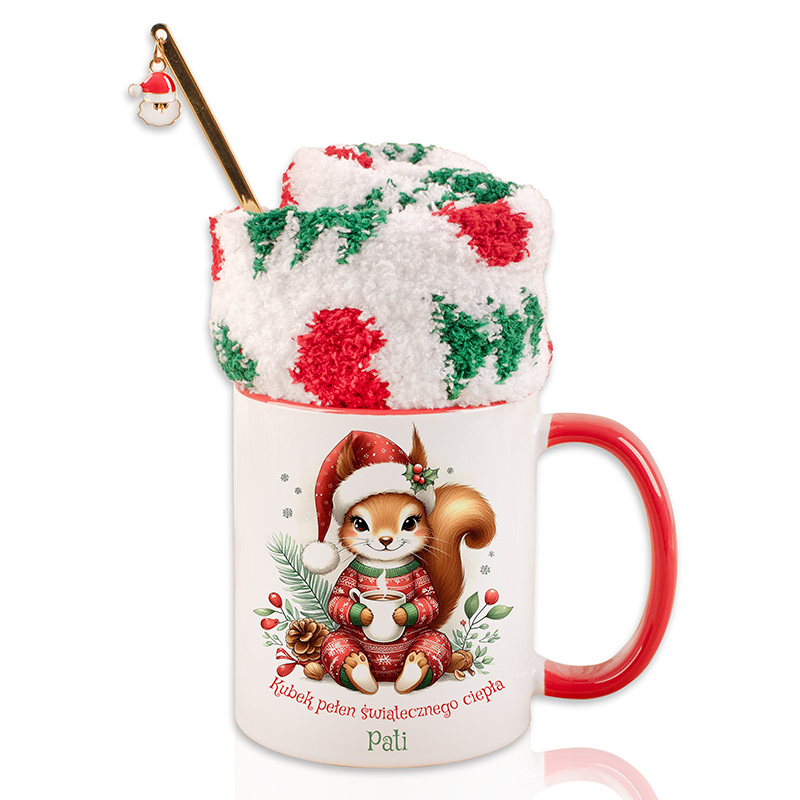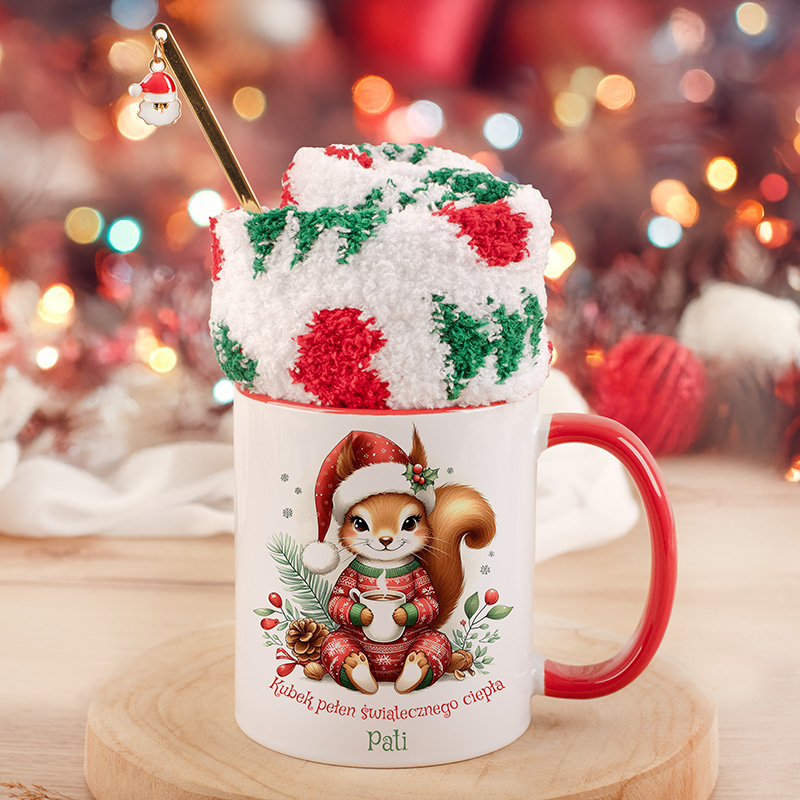 Kubek ozdobiony grafiką uroczej wiewiórki w świątecznym sweterku, która trzyma kubek z gorącym napojem. Pod napisem „Kubek pełen świątecznego ciepła” znajduje się imię, które jest  personalizowane, co czyni ten prezent jeszcze bardziej osobistym.  W zestawie znajdują się także miękkie skarpety w świątecznych kolorach. Dodatkowo w zestawie znajduje się złota łyżeczka ozdobiona maleńką zawieszką.