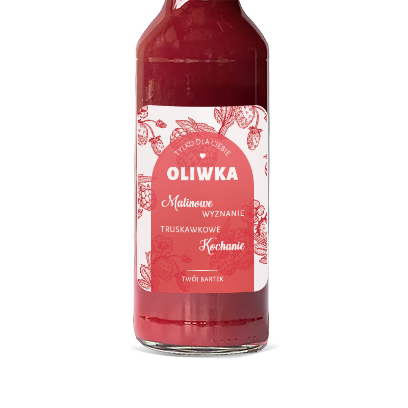 Szklana butelka z musem malinowo-truskawkowym to idealny prezent dla bliskiej osoby. Etykieta na butelce utrzymana jest w czerwono-różowej kolorystyce i nawiązuje do owoców takich jak maliny i truskawki. Delikatne ilustracje liści i owoców tworzą naturalne, przyjemne dla oka tło, a centralnie umieszczony napis podkreśla, że to produkt „tylko dla Ciebie”.