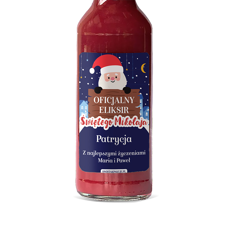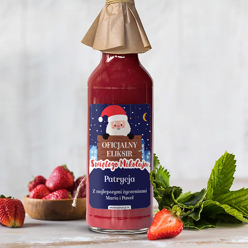 Na etykiecie przecieru znajduje się Święty Mikołaj oraz hasło „Oficjalny Eliksir Świętego Mikołaja”. Dodatkowo można dodać imię i dedykację. Całość tworzy naturalną, ręcznie dopracowaną kompozycję. Butelka przyciąga wzrok i pasuje do każdej świątecznej aranżacji. W butelce znajduje się 500 ml musu.