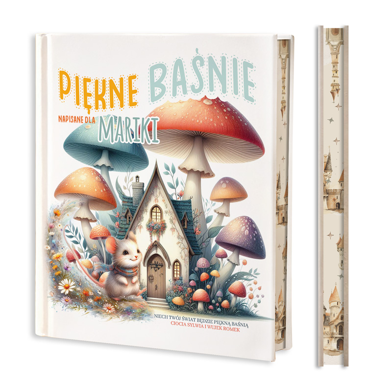 Ilustrowana okładka książki z tytułem "Piękne Baśnie" dla Mariki, z domkiem i dużymi grzybami w kolorowej scenerii.