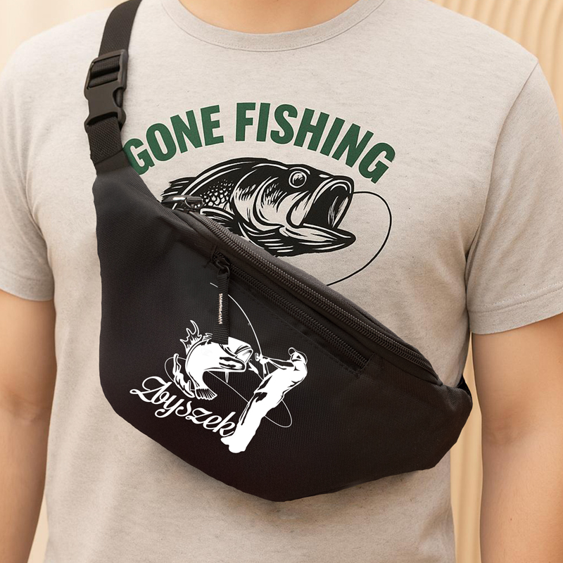 Czarna nerka dla wędkarza z grafiką ryby i możliwością personalizacji to praktyczny i pomysłowy prezent dla każdego miłośnika łowienia ryb. Trwała, wygodna i stylowa – świetna na wyprawy i na co dzień.