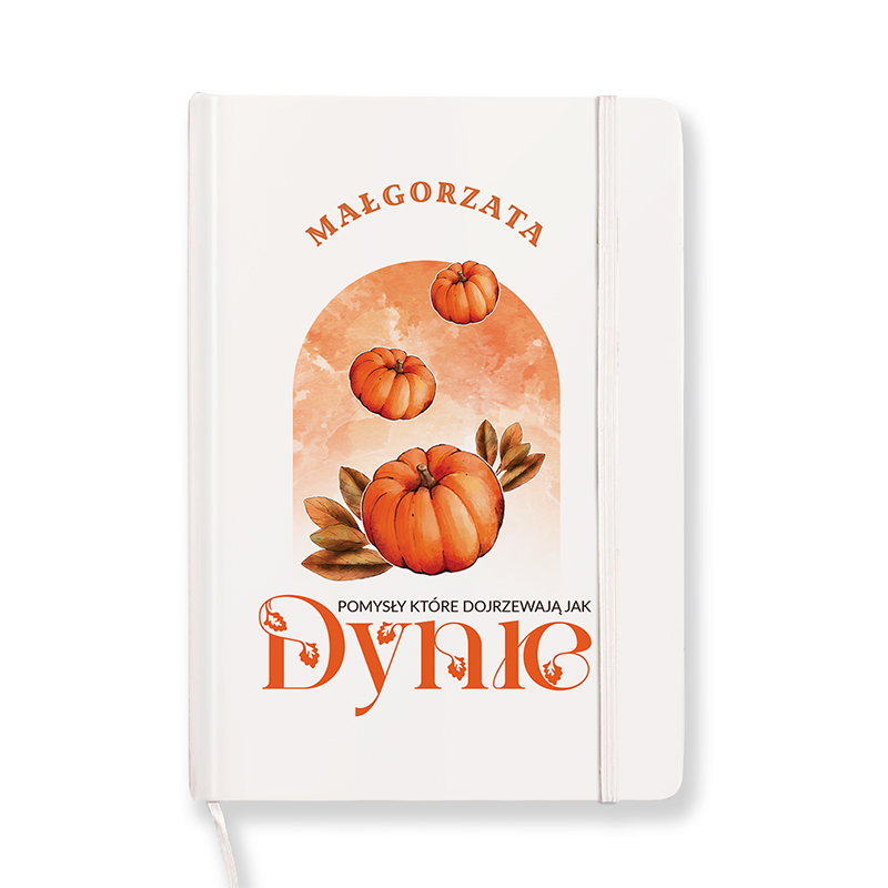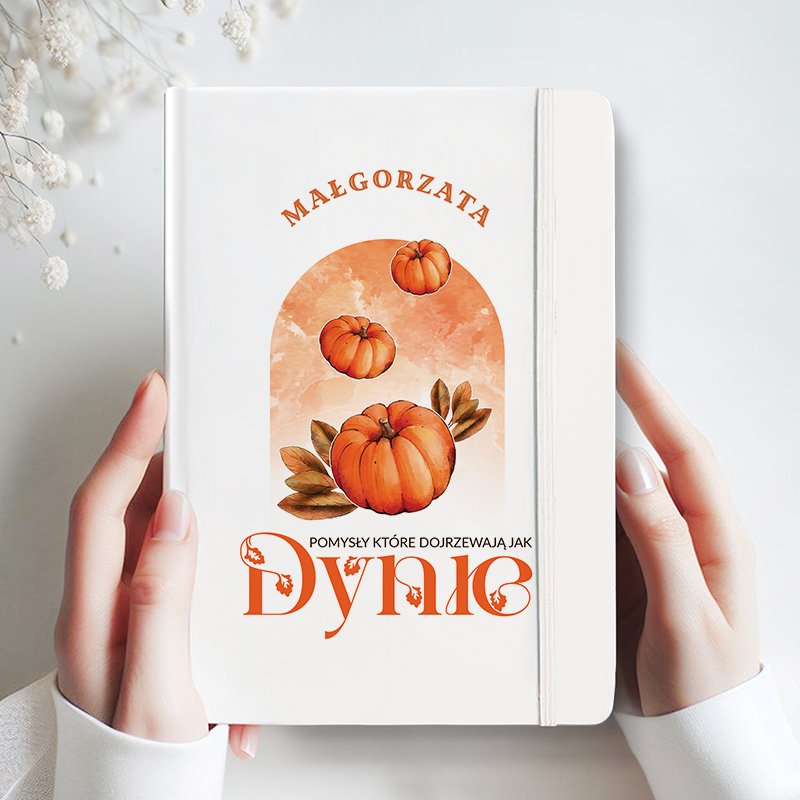 Na okładce notatnika jesiennego z motywem dyni i imieniem widnieje personalizowany napis „[Imię] Pomysły, które dojrzewają jak dynie”. Ilustracja przedstawia pomarańczowe dynie na tle w odcieniach zachodzącego słońca, tworząc przytulny jesienny klimat. Twarda okładka z elastyczną gumką chroni zapiski, a kartki w kratkę zachęcają do notowania inspiracji, planów dnia lub przemyśleń. Format notatnika jest poręczny i lekki, dlatego bez problemu zmieści się w torebce, plecaku lub na biurku. Personalizowane imię na okładce sprawia, że staje się on wyjątkowym przedmiotem codziennego użytku, pełnym ciepła i jesiennego uroku.
