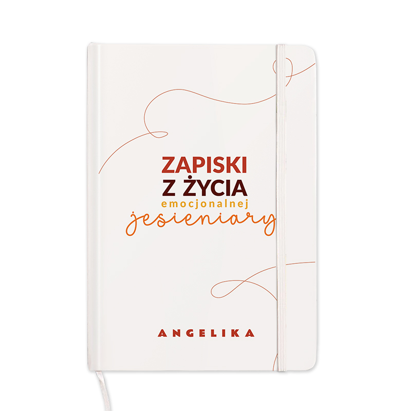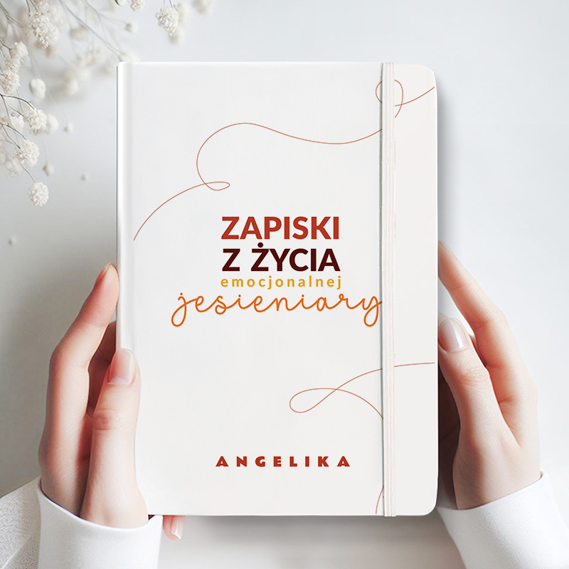 Na okładce notatnika emocjonalnej jesieniary z imieniem znajduje się napis: „Zapiski z życia emocjonalnej jesieniary” oraz imię właścicielki. Prosty, minimalistyczny design w ciepłych odcieniach brązu i pomarańczu oddaje esencję jesieni – spokój, delikatność i nutę nostalgii. Notatnik ma twardą okładkę i elastyczną gumkę, która pozwala bezpiecznie przechowywać zapiski, listy czy szkice. W środku znajdują się kartki w kratke, gotowe na zapisywanie planów dnia, pomysłów, cytatów albo inspiracji. Format jest poręczny, dzięki czemu można zabrać notatnik ze sobą wszędzie – do kawiarni, pracy czy na spacer po parku. Personalizowane imię na okładce sprawia, że staje się on wyjątkowym towarzyszem codzienności, który łączy praktyczność z odrobiną sentymentu. Ponadto okładka ma subtelny, elegancki charakter, dzięki czemu pasuje zarówno do domowego biurka, jak i do torebki. To nie tylko zeszyt, ale mała przestrzeń, w której można uporządkować swoje emocje i myśli.