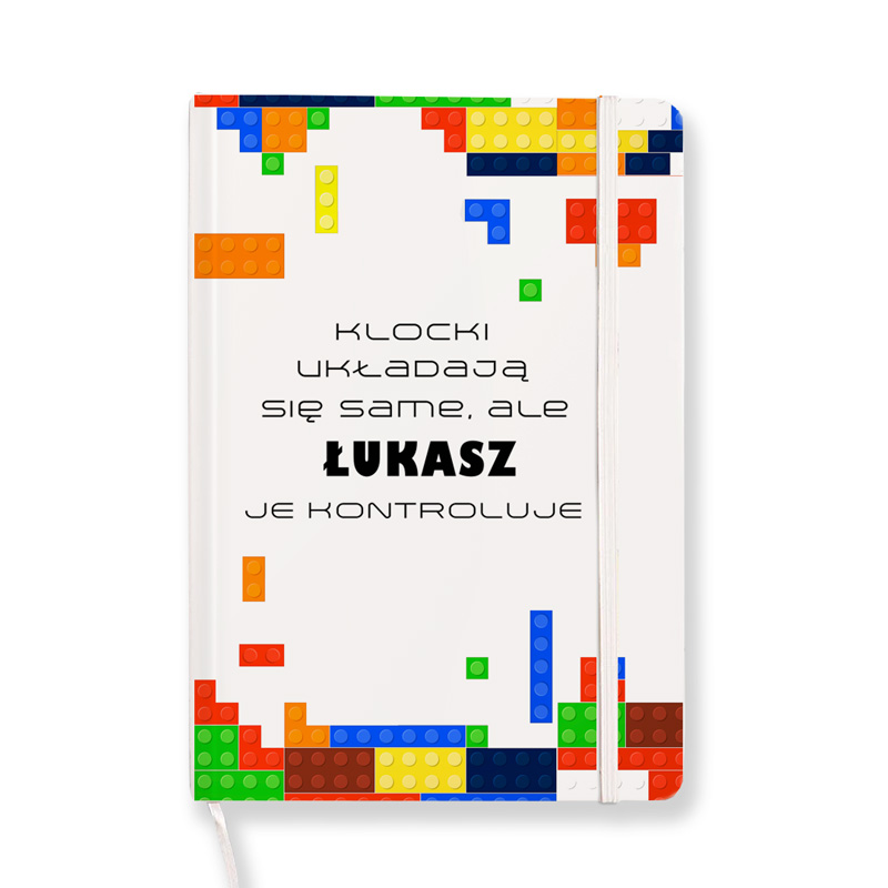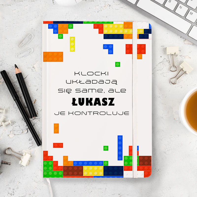 Notatnik został zaprojektowany z myślą o codziennym użytkowaniu – w szkole, pracy lub w domu. Okładkę zdobi graficzny motyw klocków oraz napis: “Klocki układają się same, ale IMIĘ je kontroluje”. Wnętrze notatnika wypełniają kartki w kratkę, idealne do zapisywania notatek, planów, pomysłów lub rysunków. Dzięki poręcznemu formatowi notatnik łatwo zmieści się w plecaku lub torbie i może towarzyszyć na co dzień. Dodatkowym atutem jest praktyczna gumka, która zabezpiecza notatnik przed otwieraniem się oraz tasiemka do zaznaczania stron, ułatwiająca szybki powrót do ważnych notatek.