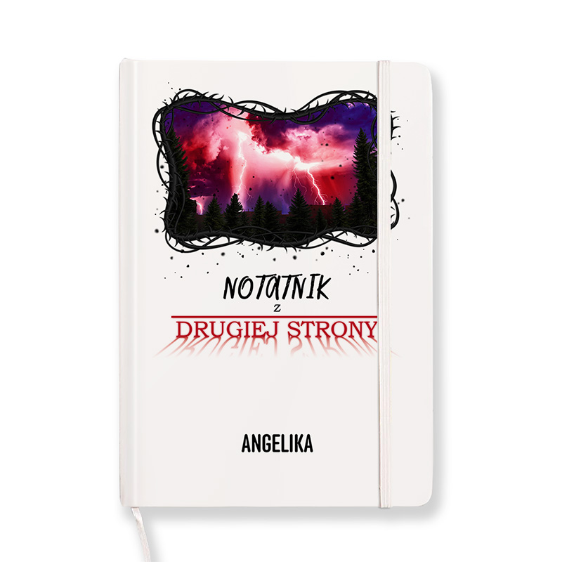 Na okładce notesu widnieje ilustracja przedstawiająca las w klimacie „Upside Down”, z błyskawicami rozświetlającymi purpurowe niebo. Czarne ramki i ciekawa czcionka natychmiast budzą skojarzenia z tajemniczą rzeczywistością równoległą znaną z Netflixowego hitu. Napis „Notatnik z Drugiej Strony” nadaje mu wyjątkowego charakteru, a personalizacja imieniem sprawia, że prezent staje się całkowicie unikalny.  Wewnątrz notatnika znajdują kartki w kratkę, idealne do zapisywania pomysłów czy robienia szkiców. Notatnik posiada praktyczną gumkę zabezpieczającą i tasiemkę do zaznaczania stron, co czyni go funkcjonalnym i wygodnym notesem. Dzięki poręcznemu formatowi A5 zmieści się do torby, plecaka czy szkolnej szafki.