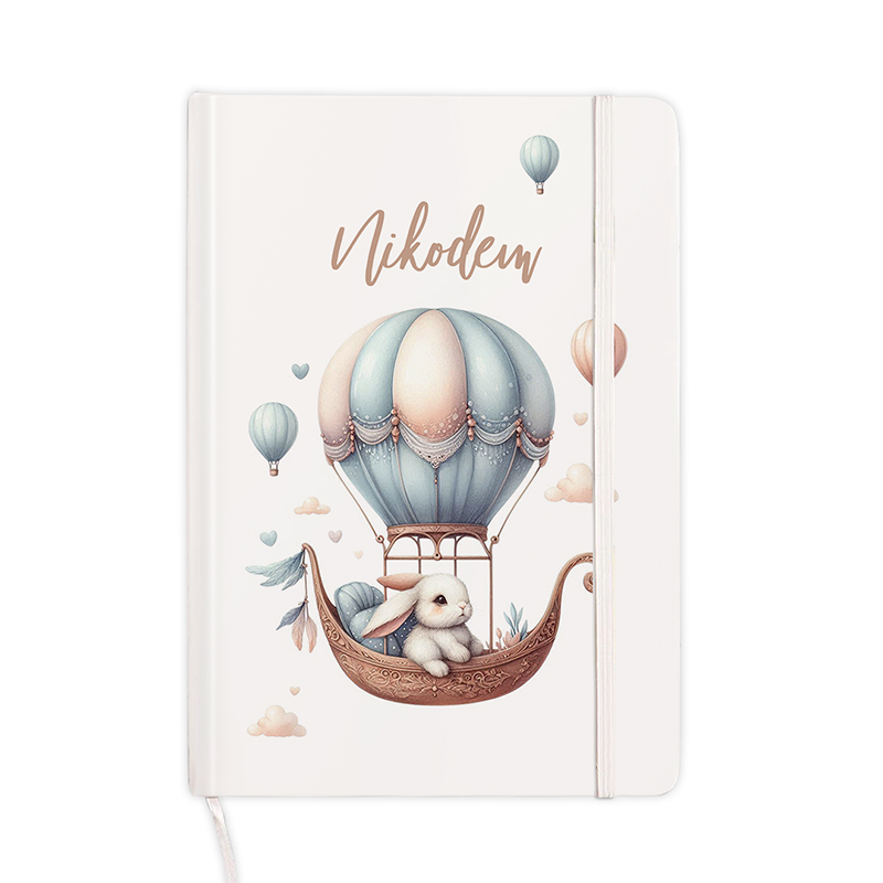 Personalizowany notes to praktyczny i estetyczny dodatek do dziecięcej wyprawki. Na okładce nadrukowane jest imię dziecka oraz ilustracja króliczka siedzącego w koszu balonu, unoszącego się wśród chmurek i baloników. Delikatna kolorystyka w odcieniach błękitu, różu i beżu nadaje całości lekki, dziecięcy charakter.  Notes ma  twardą okładkę, która pomaga zabezpieczyć wnętrze. Elastyczna gumka umożliwia wygodne zamknięcie i zapobiega przypadkowemu otwieraniu się zeszytu. Dodatkowo wewnątrz znajduje się zakładka, dzięki której dziecko szybko odnajdzie swoje ostatnie zapiski czy rysunki.