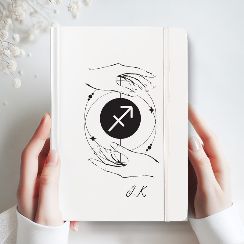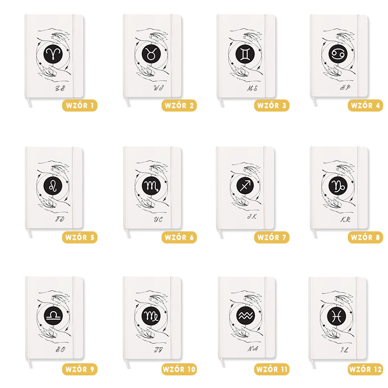 Ten personalizowany notes doskonale łączy sztukę z astrologią. Jego jasna, matowa okładka przyciąga uwagę subtelną, artystyczną grafiką. W centrum widnieje czarny okrąg z symbolem wybranego znaku zodiaku, otoczony delikatnym rysunkiem dwóch dłoni. Ponadto drobne gwiazdy i okręgi nadają całości harmonijny, kosmiczny wygląd. Na dole okładki umieszczone są Twoje inicjały, co sprawia, że notes staje się jedyny w swoim rodzaju. Dzięki temu możesz podkreślić swoją osobowość i zamiłowanie do astrologii. Notes o poręcznym rozmiarze A5 świetnie sprawdzi się w codziennym użytkowaniu. Kartki w kratkę ułatwiają organizację myśli i pozwalają na przejrzyste notowanie. Możesz w nim zapisywać plany, prowadzić pamiętnik lub tworzyć dziennik astrologiczny. Wysokiej jakości papier zapewnia komfort pisania zarówno piórem, jak i długopisem. Co więcej, elastyczna gumka zabezpiecza notes przed przypadkowym otwarciem, a tasiemka pomaga szybko odnaleźć ostatnie zapiski. Dzięki tym funkcjom korzystanie z niego staje się wygodne i przyjemne.