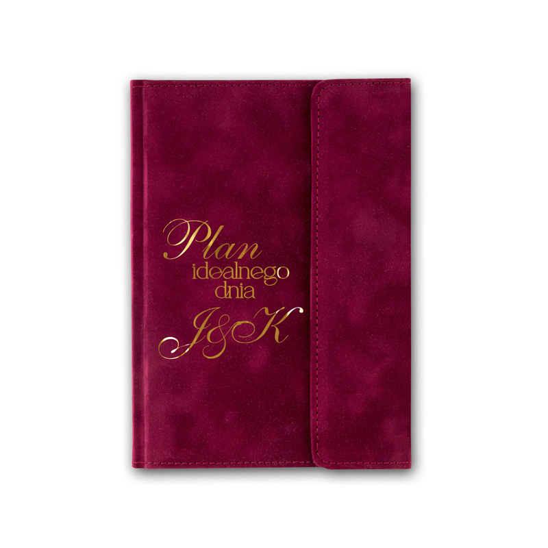 Notes ma miękką, welurową oprawę w kolorze bordo. Na froncie znajduje się złoty napis “Plan idealnego dnia” oraz personalizowane inicjały. Całość zapina się na klapkę z magnesem, co chroni wnętrze przed zniszczeniem.
