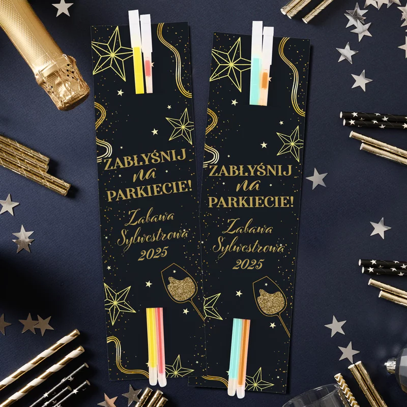 Wyjątkowy akcent z pewnością uświetni niejedną zabawę i sprawi, że będzie inna niż wszystkie pozostałe. Wykorzystaj go bez względu na to, czy mowa o wielkim balu, domówce w gonie najbliższych, czy kameralnym spotkaniu w gronie rodzinnym. Sylwester na parkiecie? Nie może zabraknąć w takim razie imprezowych gadżetów. Świecące w ciemności fluorescencyjne pałeczki na rękę będą doskonałym dodatkiem na imprezie z okazji pożegnania starego roku. Zestaw stanowią dwie pałeczki, które umieszczone są na specjalnym bileciku z sylwestrowo-noworoczną grafiką. Dopełnieniem do ciemnego tła ze złotymi akcentami będzie napis: ZABŁYŚNIJ NA PARKIECIE! Zabawa sylwestrowa 2025. Doskonały gadżet zarówno przy organizacji wielkiego balu sylwestrowego, jak i na kameralnej domówce w gronie rodziny i przyjaciół.