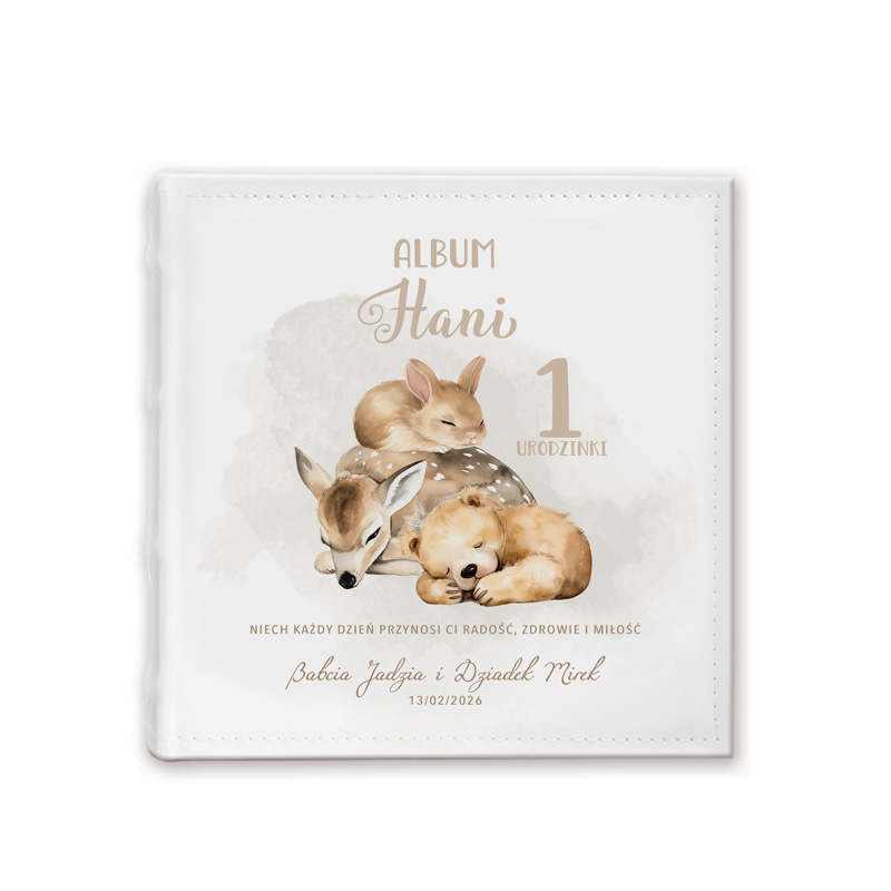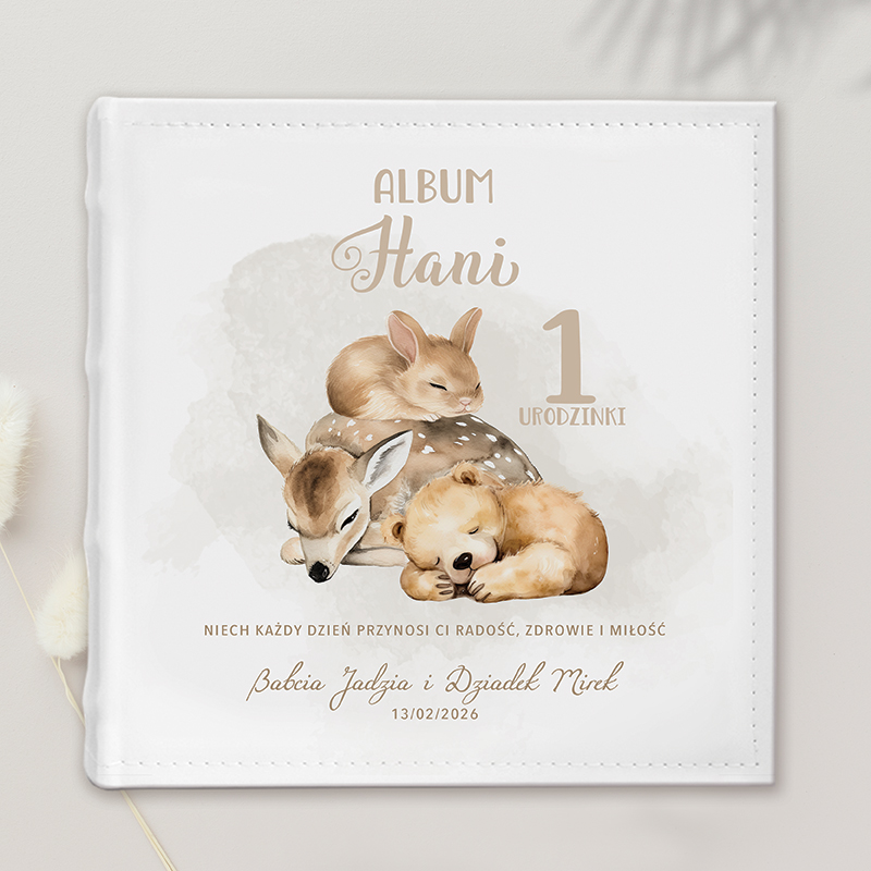 Personalizowany album na zdjęcia to oryginalny i pełen uroku prezent na roczek, który w piękny sposób pomoże zachować wspomnienia z pierwszych, najcenniejszych chwil życia dziecka. Okładkę zdobi urocza ilustracja śpiących leśnych zwierzątek, imię malucha, data oraz dedykacja od najbliższych, co nadaje pamiątce wyjątkowego, sentymentalnego charakteru.