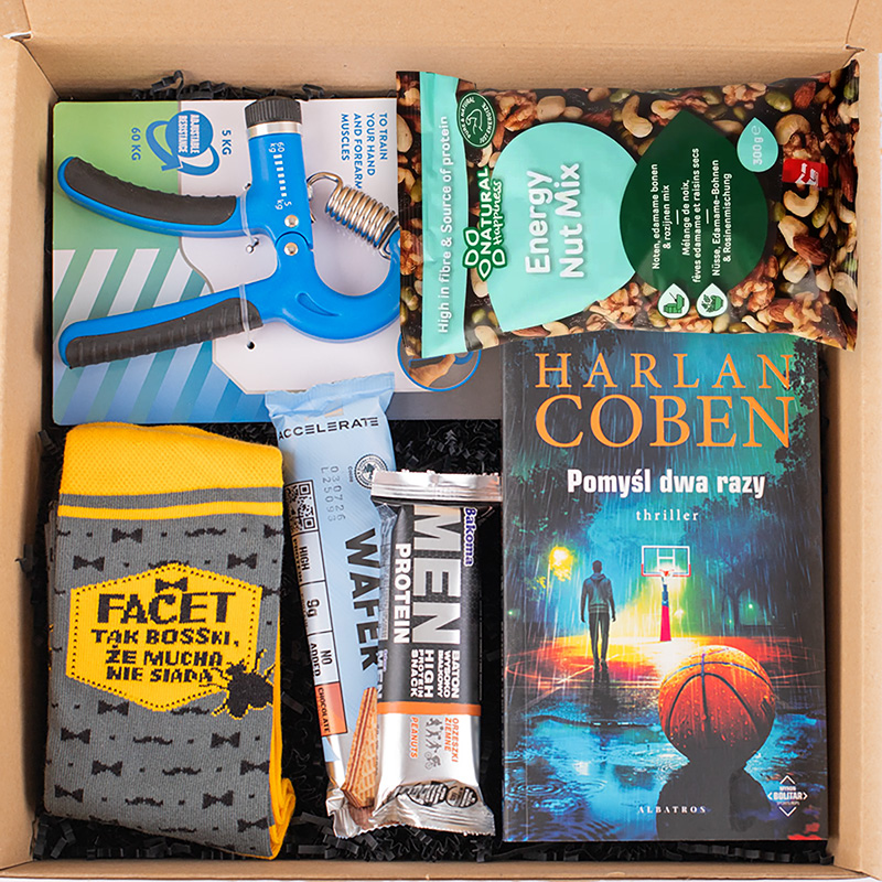 Zestaw wyróżniają również skarpetki z napisem „Facet tak boski, że mucha nie siada”, które wprowadzają do całości odrobinę humoru i nadają prezentowi lżejszego charakteru. To praktyczny element codziennej garderoby, który jednocześnie wywołuje uśmiech. Całość dopełnia książka Harlana Cobena „Pomyśl dwa razy” – thriller pełen napięcia i zaskakujących zwrotów akcji, który pozwala oderwać się od codziennych obowiązków i zapewnia chwilę rozrywki po aktywnym dniu. Ten zestaw łączy w sobie akcesoria sportowe, białkowe przekąski, zabawny dodatek i książkę, dzięki czemu tworzy oryginalny i gotowy do wręczenia prezent dla mężczyzny, który ceni aktywność i dobry humor.