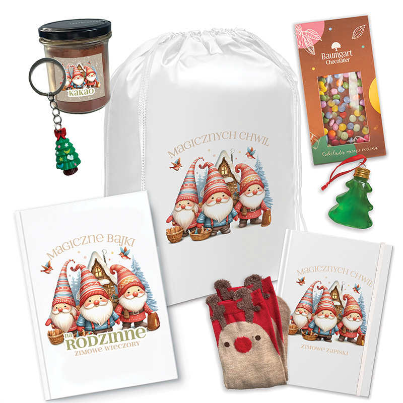 Stwórz magiczny klimat Bożego Narodzenia, wręczając dziecku nasz wyjątkowy prezent. Wszystkie produkty umieszczamy w eleganckim worku prezentowym ozdobionym uroczymi skrzatami i napisem „Magicznych Chwil”. Worek można później wykorzystać do przechowywania skarbów, co czyni go nie tylko pięknym, ale i praktycznym dodatkiem.