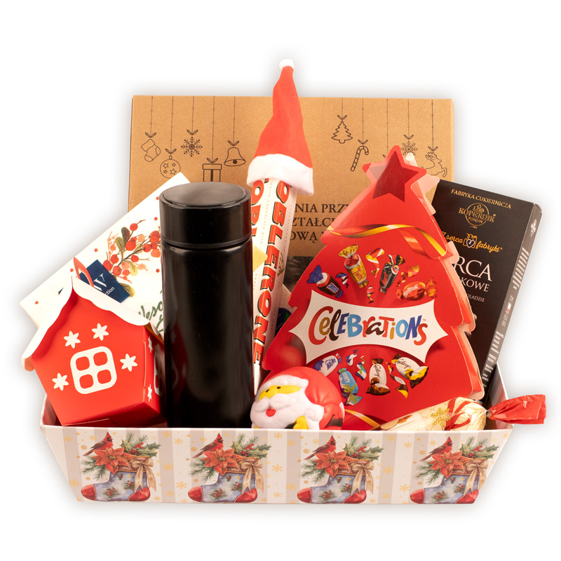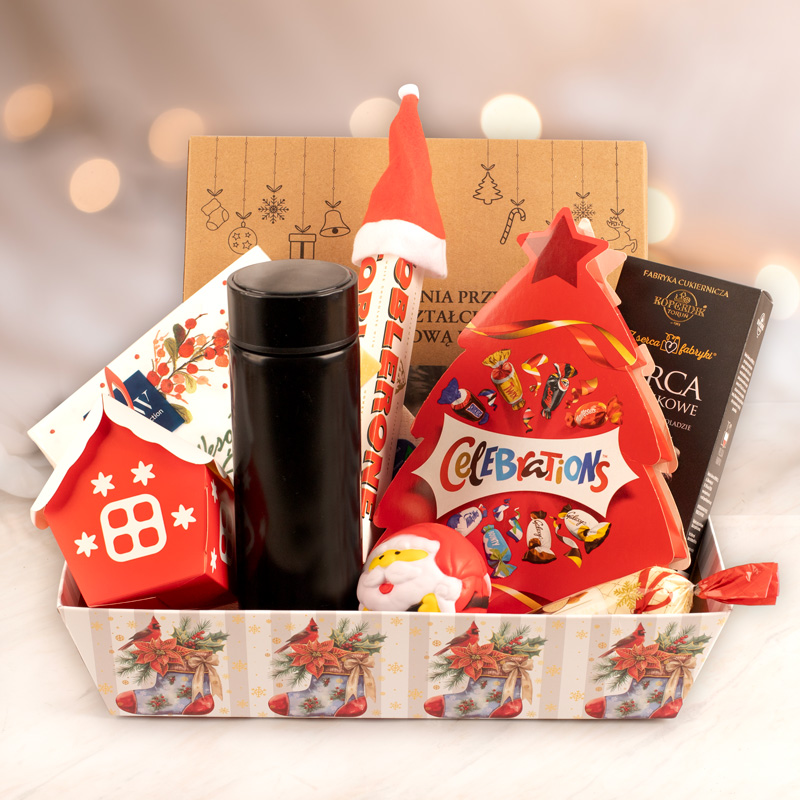 W skład paczki wchodzi papierowy domek, wypełniony pięcioma tradycyjnymi, polskimi krówkami. Obok niego znajduje się czekolada Toblerone, ozdobiona zabawną czapeczką Mikołaja. W paczce umieszczono także elegancki, czarny termos z cyfrowym termometrem na zakrętce, dzięki wbudowanemu wyświetlaczowi z łatwością można sprawdzić, czy kawa lub herbata ma idealną temperaturę do picia. Wśród elementów zestawu znalazła się także świąteczna piłka antystresowa w kształcie Mikołaja. Nie mogło również zabraknąć słodyczy – znajdziesz tu opakowanie kultowych cukierków Celebrations, piernikowe serca, a także marcepanowy chlebek. Całość uzupełniają dekoracyjne serwetki oraz talerz z miseczkami w kształcie choinek.