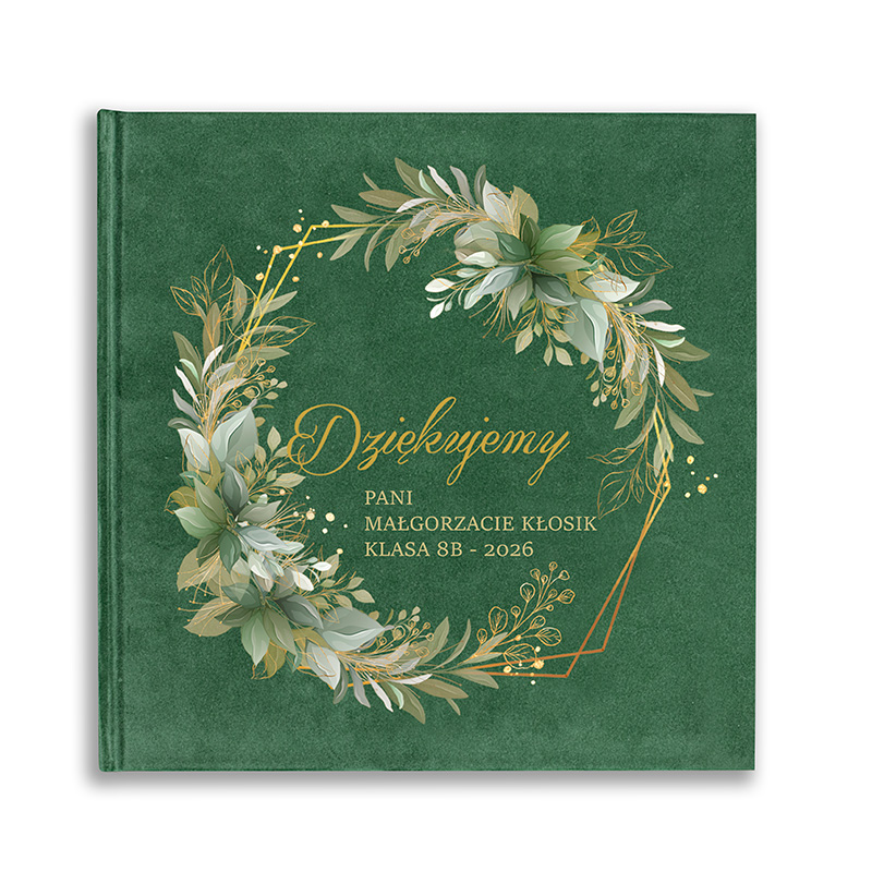 Stylowa, twarda oprawa ozdobiona delikatnym wieńcem i złotym napisem „Dziękujemy”, sprawia, że album prezentuje się niezwykle elegancko i z klasą. Dzięki personalizacji z imieniem nauczyciela i nazwą klasy staje się on unikalnym upominkiem o sentymentalnym znaczeniu. To nie tylko piękny przedmiot, ale przede wszystkim prezent od uczniów, który zatrzymuje najważniejsze wspomnienia z lat szkolnych. Wewnątrz znajduje się przestrzeń na zdjęcia, wpisy, rysunki i osobiste dedykacje. Dzięki temu każdy wychowawca poczuje, jak ważną rolę odegrał w życiu swoich uczniów. Taki gest nabiera szczególnego znaczenia podczas zakończenia roku szkolnego, ostatniego dnia w klasie lub uroczystego pożegnania.