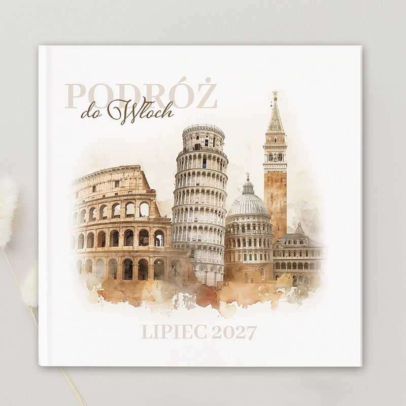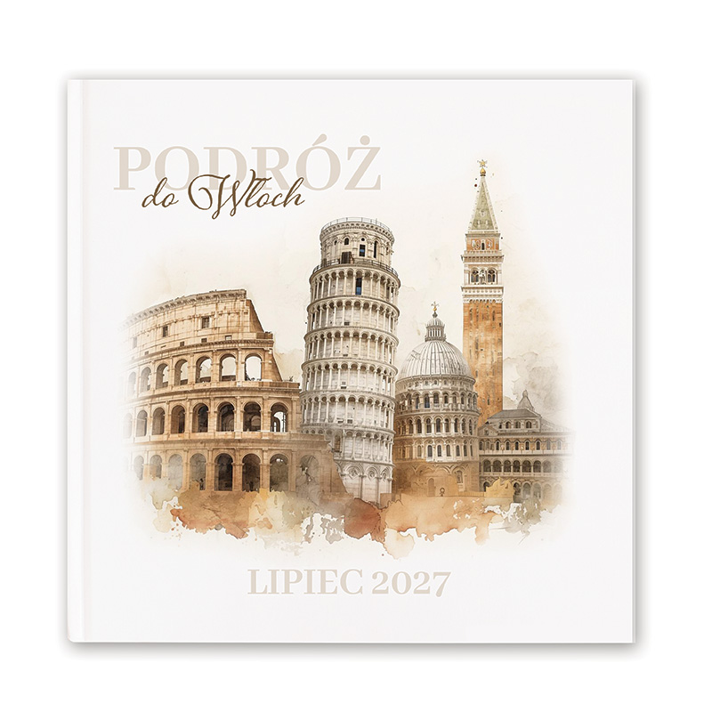 Pamiętnik zachwyca artystyczną okładką przedstawiającą najbardziej rozpoznawalne symbole Włoch – Koloseum, Krzywą Wieżę w Pizie oraz wenecką dzwonnicę. Na froncie znajduje się ozdobny napis „Podróż do Włoch”, a u dołu widnieje personalizowana data, podkreślająca osobisty wymiar dziennika. Całość prezentuje się lekko, nowocześnie i harmonijnie. Spoglądając na okładkę możemy przywołać wspomnienia z włoskich wakacji. W pamiętniku znajdują się białe kartki idealne do kreatywnego wypełnienia stron – zdjęciami, biletami z podróży i zapiskami.