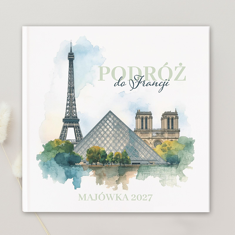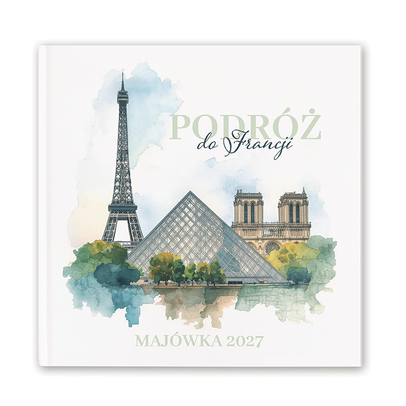 Personalizowany dziennik podróży wyróżnia się subtelną, artystyczną okładką inspirowaną francuskim klimatem. Na grafice znajdują się ikoniczne symbole Paryża: majestatyczna Wieża Eiffla, piramida Luwru oraz zabytkowa katedra Notre-Dame, które tworzą harmonijną kompozycję. Na okładce widnieje stylowy napis „Podróż do Francji”, a u dołu umieszczono subtelny napis z datą wyjazdu.