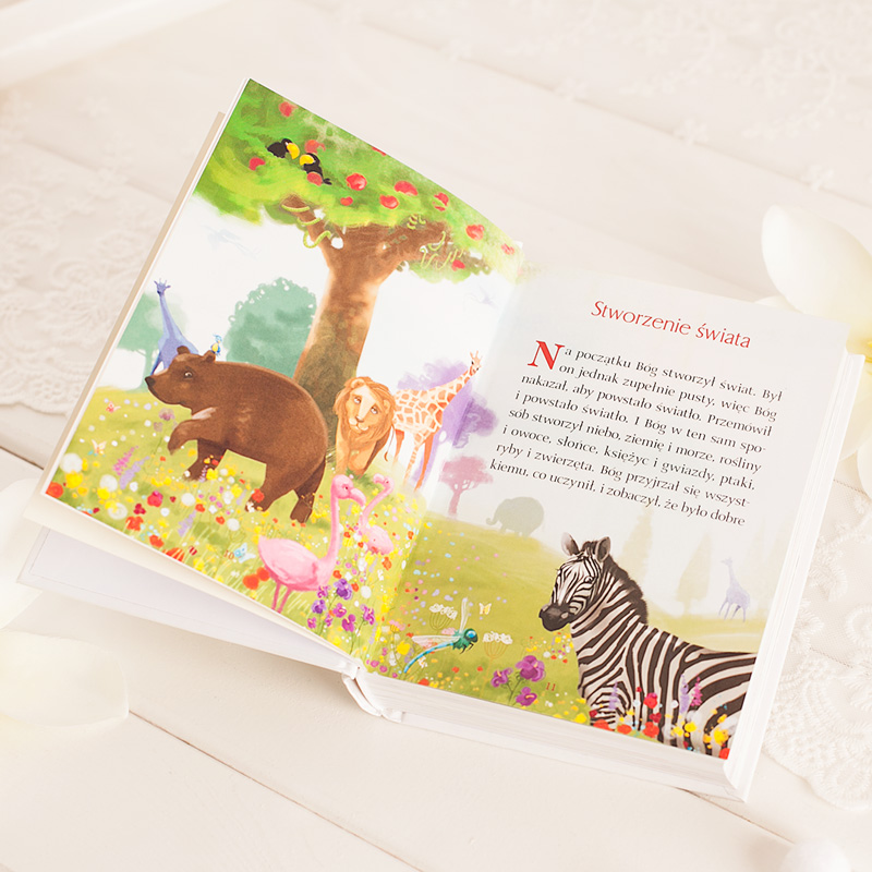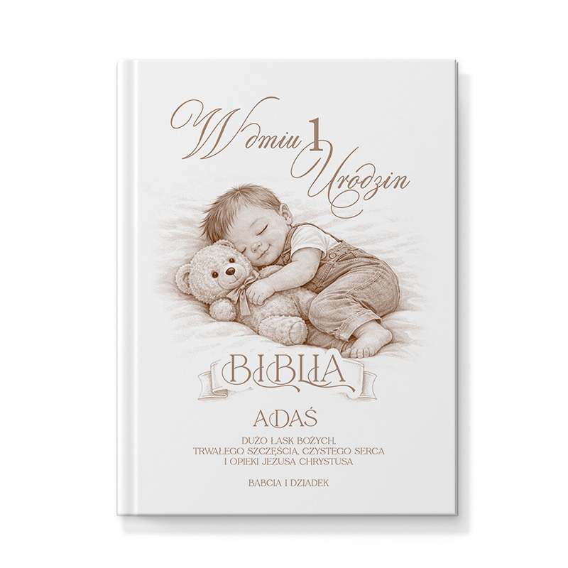 Na froncie Bibli znajduje się piękna grafika przedstawiająca śpiącego maluszka przytulającego misia. Ponadto widoczny jest napis „W dniu 1 Urodzin” oraz „Biblia”, a także personalizowane imię dziecka. Dodatkowo umieszczona jest dedykacja z gotowymi życzeniami „Dużo łask Bożych, trwałego szczęścia, czystego serca i opieki Jezusa Chrystusa”. Poniżej życzeń znalazł się podpis osób wręczających prezent. Wewnątrz Biblii znajdują się historie biblijne oraz kolorowe ilustracje, które dodatkowo zaciekawią dziecko. Teksty zostały napisane prostym językiem, dlatego idealnie nadają się do wspólnego czytania z dzieckiem.