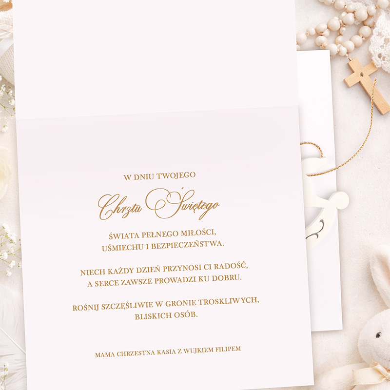 Elegancja, delikatność i wyjątkowy przekaz sprawiają, że personalizowana kartka na Chrzest Święty z zawieszką to doskonały wybór dla osób, które chcą podarować wyjątkową pamiątkę Chrztu.