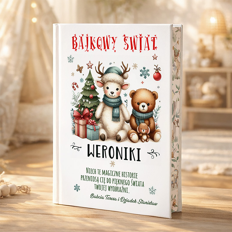 Okładka książeczka z bajkami zachwyca świątecznym klimatem i uroczym designem. Na pierwszym planie widnieją dwa sympatyczne zwierzątka – owieczka w niebieskim szaliku i miś w świątecznym ubranku. Zwierzątka siedzą obok siebie na tle i prezentów, co tworzy ciepłą, zimową atmosferę. Na górze okładki umieszczono napis „Bajkowy Świat” w ozdobnej, czerwonej czcionce, która dodaje świątecznego charakteru. Centralnym punktem jest personalizowany napis z imieniem dziecka. Całość dopełniają subtelne detale, takie jak śnieżynki, bombki i pastelowe kolory, które podkreślają magiczny i bajkowy charakter książki. Na dole znajduje się miejsce na indywidualną dedykację, co sprawia, że książeczka z bajkami nabiera osobistego znaczenia. Każdy element okładki został zaprojektowany z myślą o stworzeniu ciepłego, świątecznego nastroju, który wprowadza dziecko w świat magii i opowieści.
